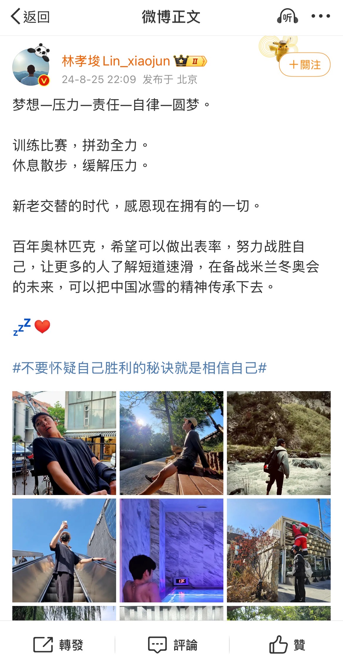 林孝埈原本為韓國運動員,歷經風波後選擇入籍中國,又在賽場上為中國贏得獎牌,這樣坎坷向上的經歷讓他頗受爭議。「夢想、壓力、責任、自律、圓夢……感恩現在擁有的一切。」這是林孝埈在社交平台上的置頂內容。這幾句話,或許正是他曲折職業生涯的映射,亦是他穿過荊棘的心靈寫照。