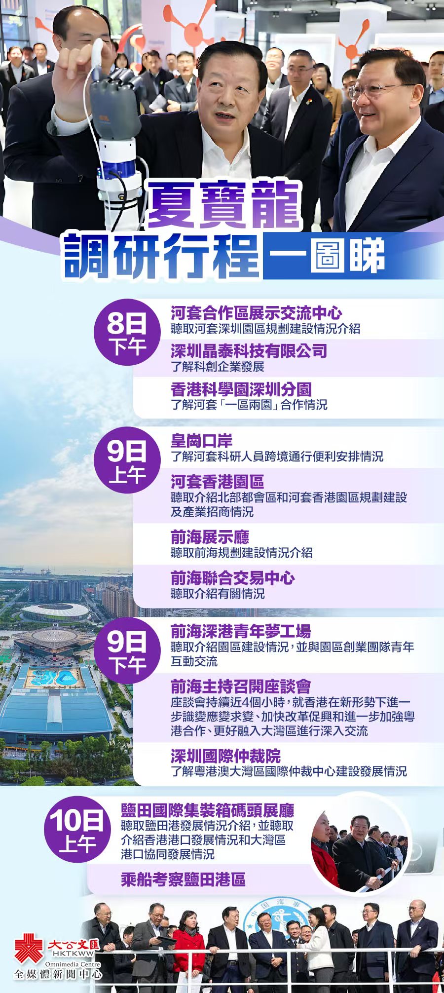 大公文匯全媒體報道,2025年2月8日至10日,中央港澳工作辦公室主任、國務院港澳事務辦公室主任夏寶龍在河套深港科技創新合作區、前海深港現代服務業合作區和鹽田港進行調研。夏寶龍主任的調研行程都有哪些?快來一圖睇清!