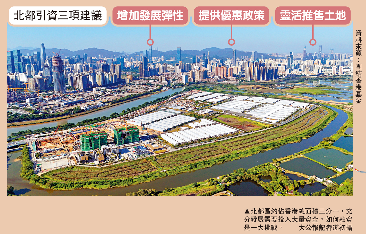 北都覆蓋元朗區和北區,約佔香港總面積三分一,發展局預計北都未來10年可提供約1700公頃熟地,充分發展需要投入大量資金,如何融資是一大挑戰。全國政協委員、立法會議員譚岳衡認為,特區政府需要根據開發項目的類型,多管齊下採取不同融資方式。他建議通過設立「開發性金融機構」,滿足本港大型基建需求,「開發性金融機構」可以牽頭通過長期銀團貸款的方式,吸引商業機構參加銀團,從而撬動更多市場化基金。