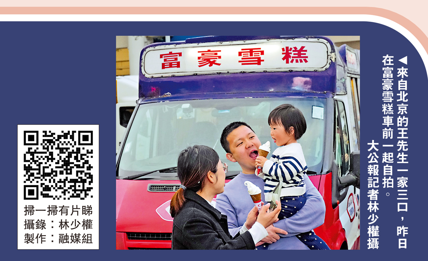 有旅客表示,富豪雪糕車見證了自己的人生重要時刻。來自北京的王先生一家三口,昨日在富豪雪糕車前一起自拍,王先生回憶,2019年與太太一起來香港拍攝婚紗照,「當時聽說富豪雪糕是香港一大特色,就站在雪糕車前隨手拍了一張,照片一直保留到現在。」