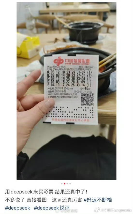 同時,網民們亦發表評論稱,提醒大家不要神話DeepSeek。有網友指出:「合計10元,中了5元?有沒有可能沒有DeepSeek,你買五組也有這個概率呢?我覺得也沒必要神話DeepSeek。」還有網民表示:「隨機概率這麼大,跟它真沒有太大關係。」