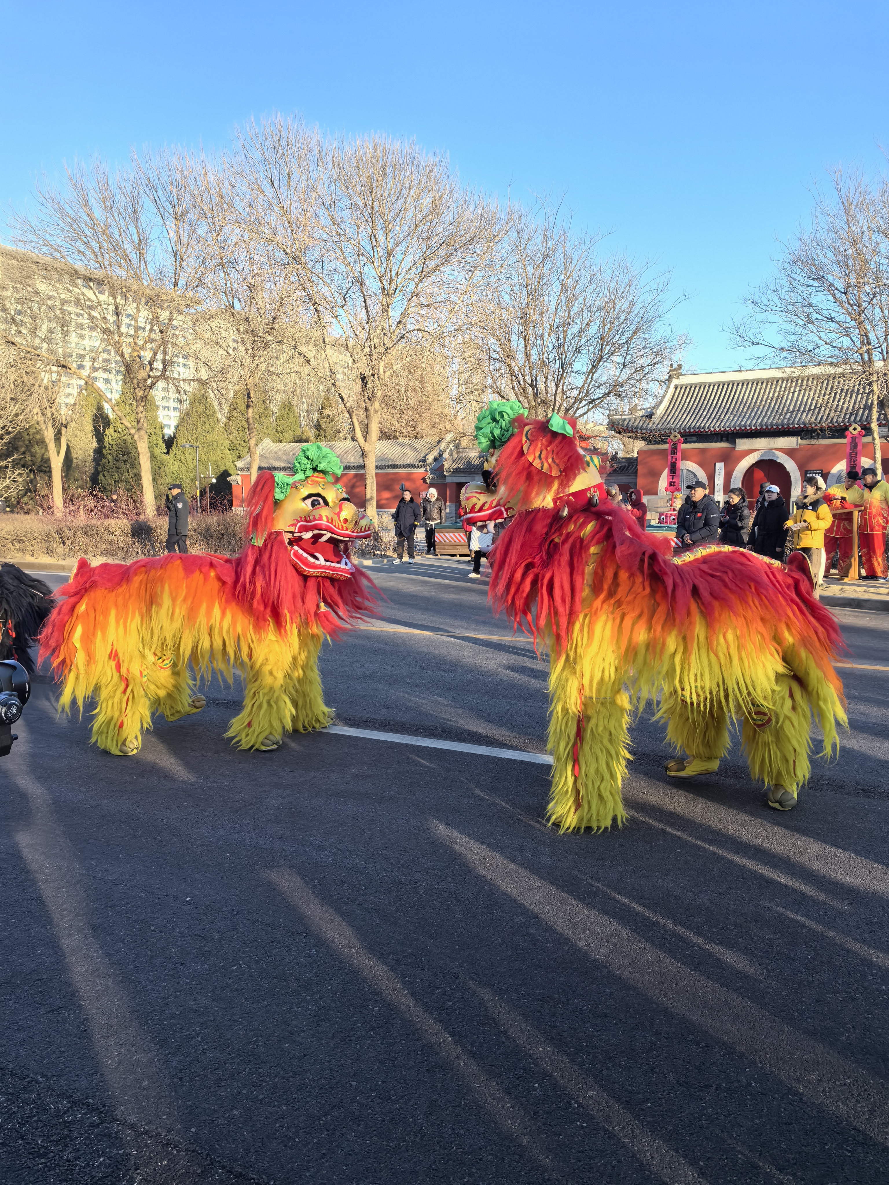 活動現場,四黃一黑五隻太獅同時出場,兇猛粗獷、形神兼備,在熱烈的鑼鼓聲中,表演「小三樣」「長五相」「單團式」「對頭」等絕活兒。國家級非遺代表性項目白紙坊太獅團隊在第七代代表性傳承人楊敬偉的帶領下,將新、奇、險、特、跳、翻、騰、躍,貫穿於太獅表演之中,使獅舞的觀賞性大增。