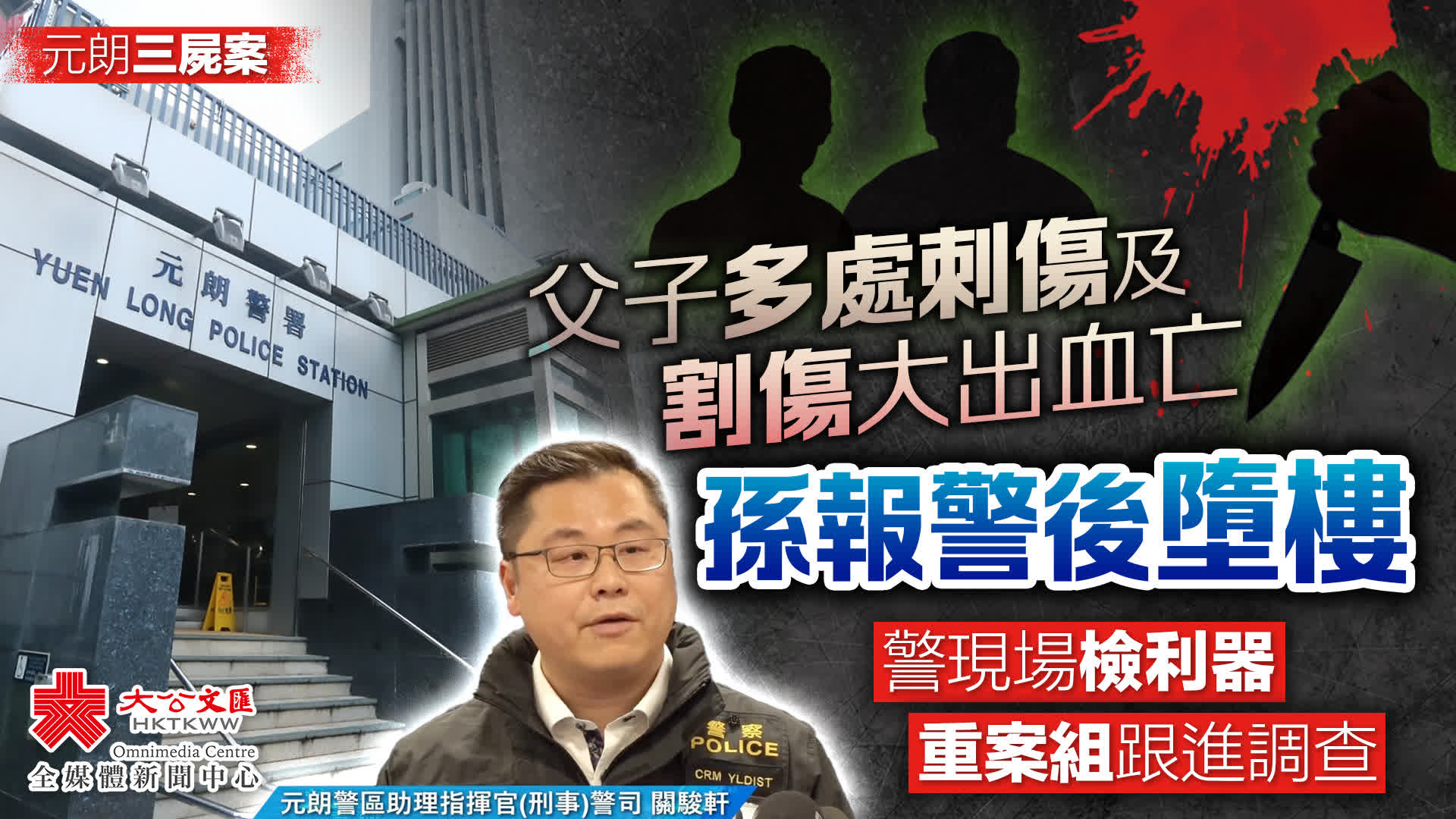 關駿軒表示,警方昨日晚上8時10分,接獲一名男子報案指,振興新村有兩名男子死亡,2分鐘後,一名19歲男子在朗屏邨由高處墮下。警員接報到達振興新村一個450呎單位,當時大閘虛掩,近廚房兩名男子倒臥地上,其中93歲老翁的面部、頸部大量出血,而69歲男子則身上多處傷痕,大量出血,現場證實死亡。兩人身旁分別有一把22厘米長廚房鉸剪及一把21厘米長生果刀,並染有血跡。調查所得,93歲男子獨居案發單位,與69歲男子為父子關係,單位內無搜掠痕跡,屋內及身上有財物。