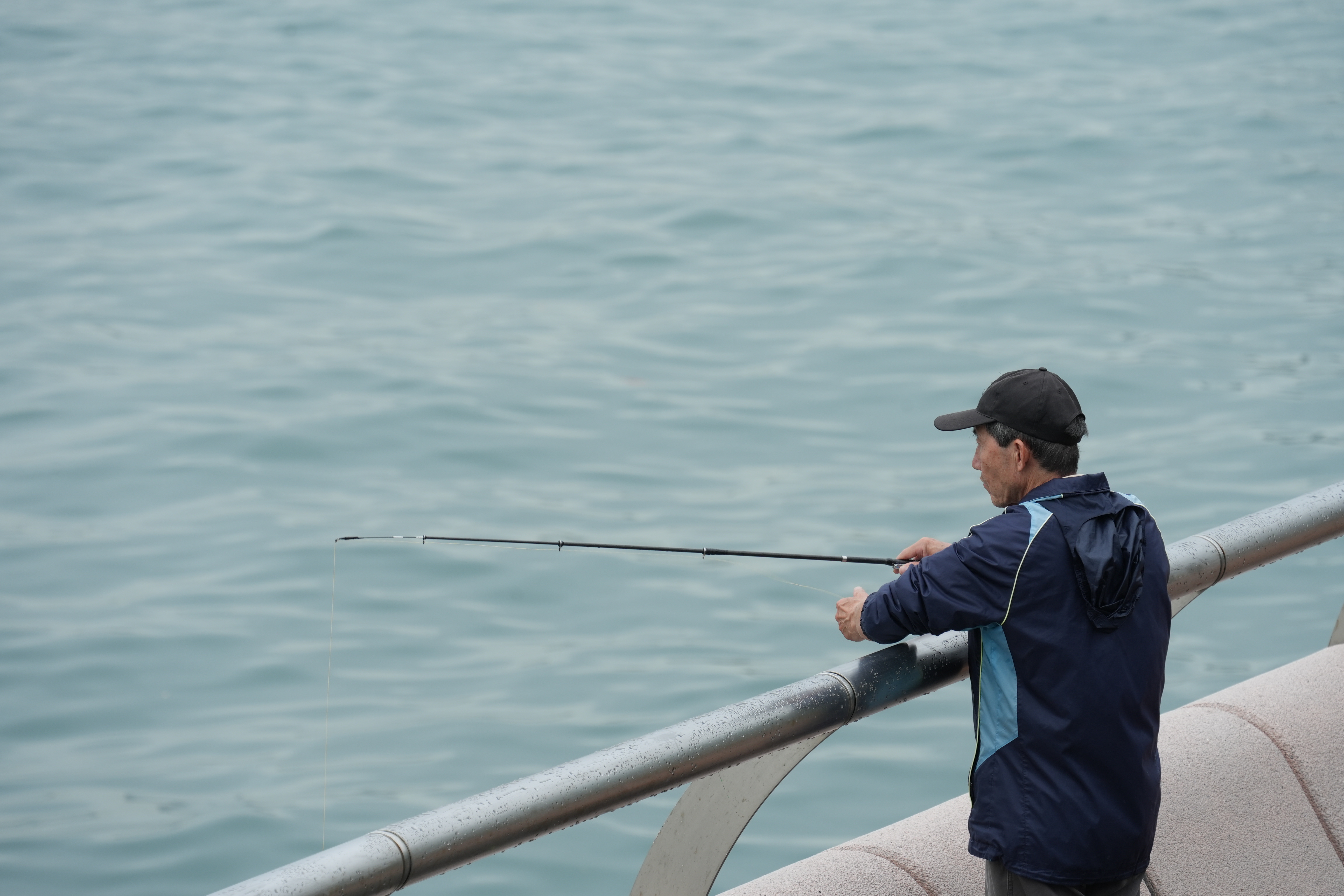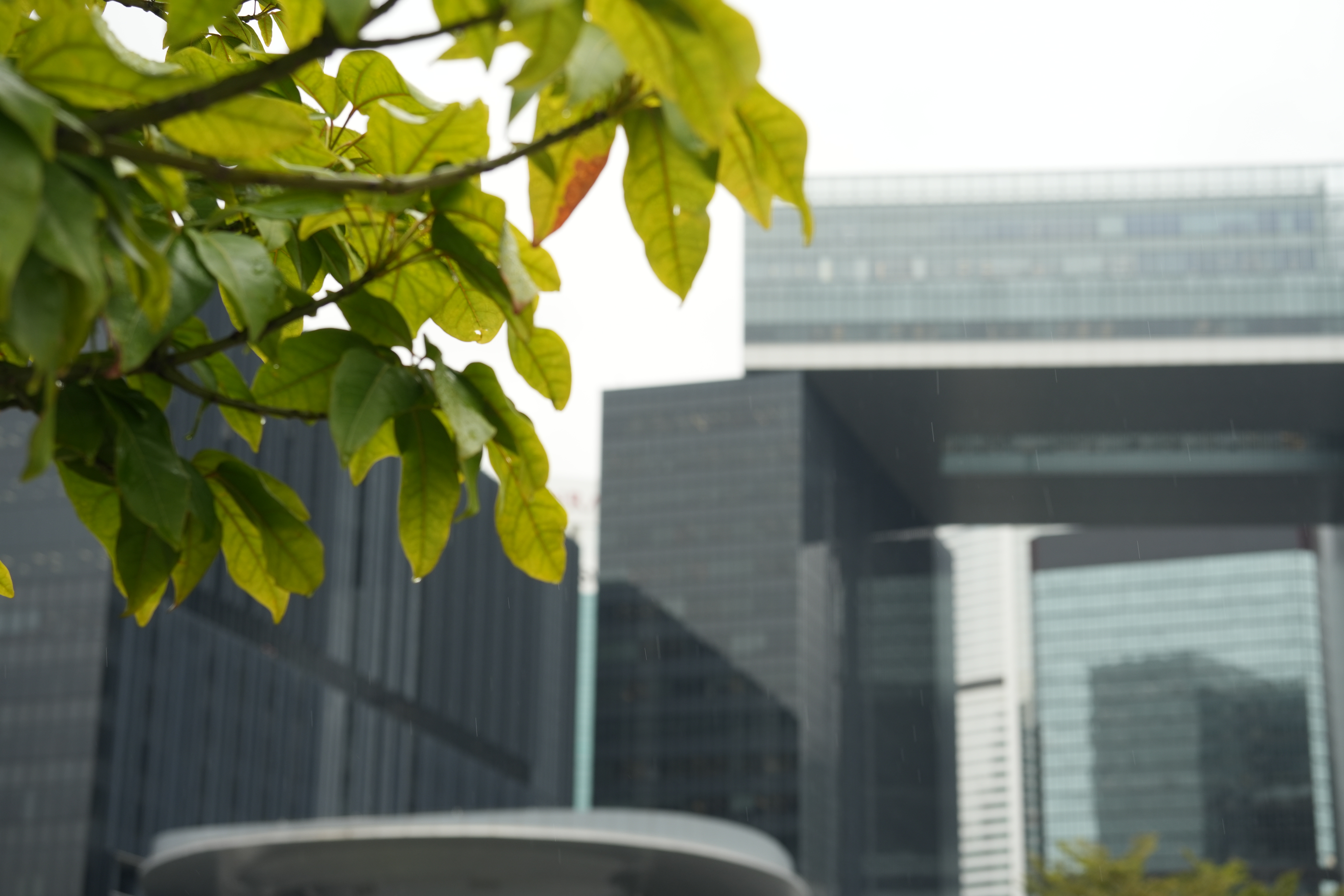 來到市區,縱觀遠處,維港兩側同尖沙咀一帶被雲霧籠罩,厚厚的積雲壓在建築物和海面上空,天際100直入雲空,輕盈的霧氣在四周縹緲浮動;而近處密集的雨落在地面,雨水則留在樹木的枝頭、街邊的欄桿上,晶瑩剔透。縱然天氣陰雨連綿,仍無法阻擋市民追求閒情雅緻的腳步,海邊市民一人安靜垂釣,構成一副獨美的雨中佳作。