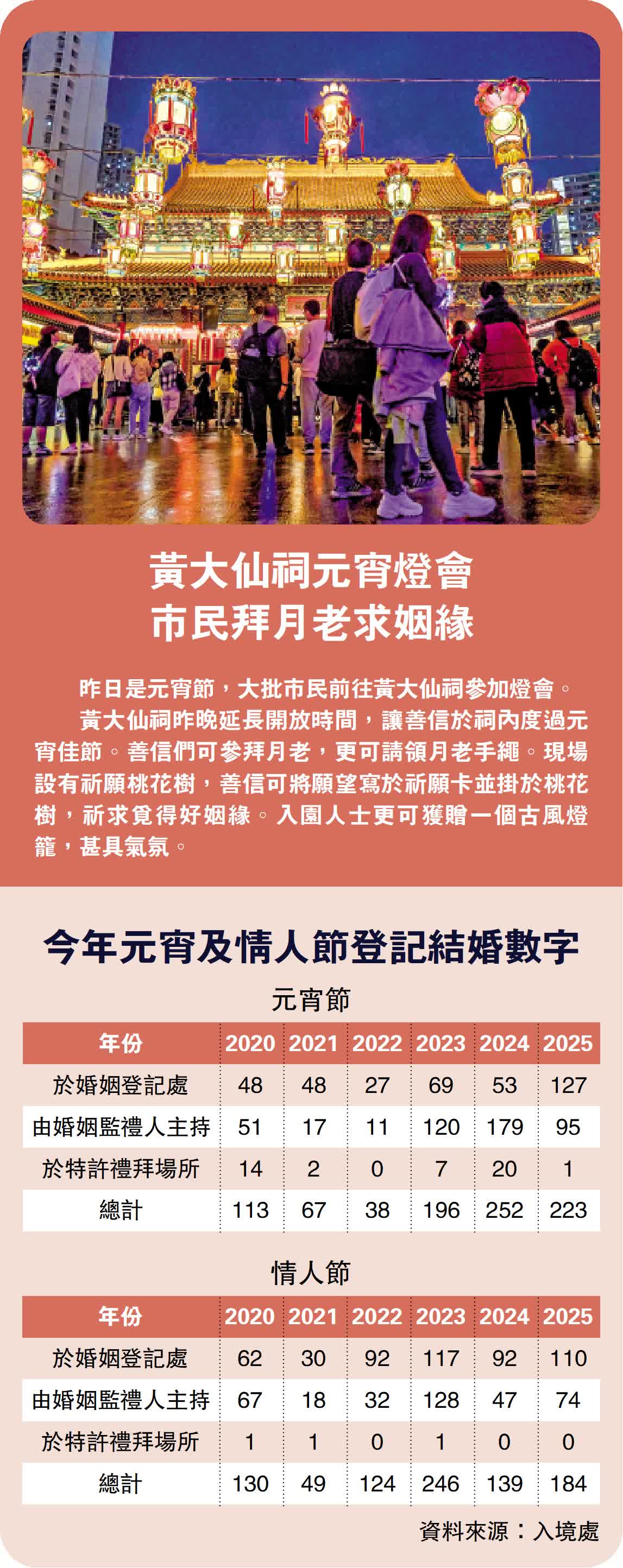 今年蛇年「雙春兼閏月」,被視為宜結婚嫁娶的好年。昨日元宵佳節,入境處數據顯示,全港共223對新人登記結婚,將軍澳婚姻登記處爆滿;明日的情人節,亦會有184對新人「拉埋天窗」。元宵與情人節兩天,預料合共有407對新人登記結婚,較去年的391對增加(見表)。