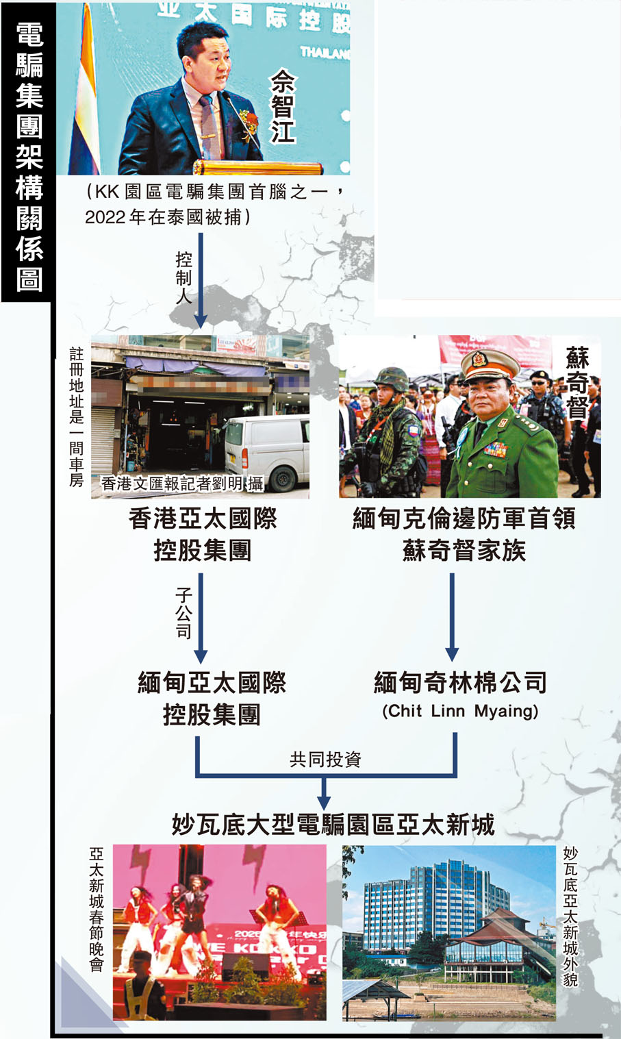 2017年,佘智江與緬甸電騙集團在妙瓦底開發亞太新城項目,成為眾多電騙集團藏身的保護傘。香港文匯報記者根據網上公開資料進行比對,發現亞太新城由緬甸奇林棉(Chit Linn Myaing)與緬甸亞太國際控股集團(下稱緬甸亞太)開發,而緬甸亞太的母公司就是香港註冊的香港亞太。