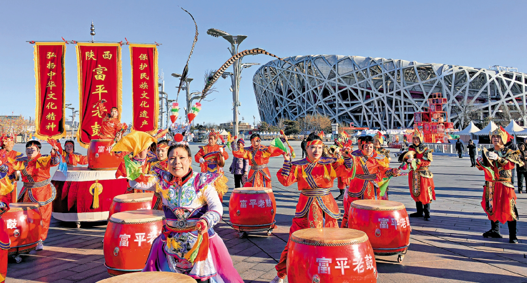 大公報綜合記者馬曉芳、新華社報道,威風凜凜的太獅,鏗鏘有力的老鼓,氣勢非凡的大龍……為慶祝北京中軸線和春節申遺成功後的首個春節,2025「京彩中軸線 非遺過大年」系列非遺特色春節慶祝活動在北京中軸線輪番亮相。正月十五(12日)元宵節一大早,非遺展演巡遊活動便在奧林匹克公園北頂娘娘廟至鳥巢南廣場一線熱鬧舉行,來自北京、浙江、福建和陝西的獅舞、龍舞、大龍、老鼓四種表演齊聚北京中軸線,「舞獅遊龍」營造出元宵節喜慶熱鬧的氛圍。