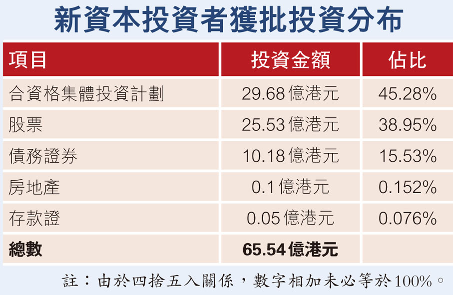 合資格的「新計劃」申請人須投資最少3,000萬元於獲許投資資產,包括投資最少2,700萬元於獲許資產,當中房地產以1,000萬元為上限,以及投入300萬元於新的「資本投資者入境計劃投資組合」。據政府數據透露,透過合資格集體投資計劃投資本港的資金約29.68億元(見表),投資股票的資金亦有25.53億元。