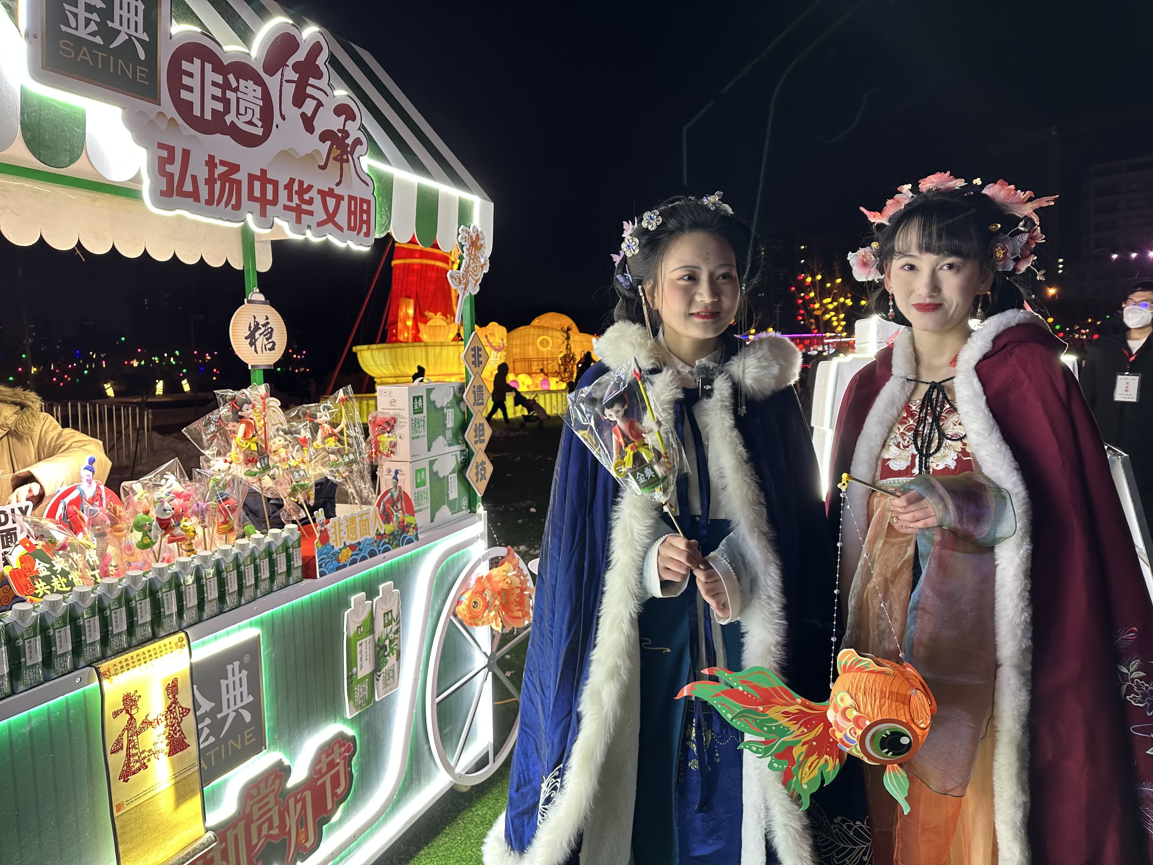 除了科技賦能,打造沉浸式體驗的文旅場景也備受遊客喜愛。在瀋陽各大燈會、文博場館、熱門景區,身着漢服逛瀋陽已成為一種時尚。特別是在燈會活動上,隨處可見身着古風、手提非遺花燈的青年遊客,他們更樂於參與到古風集市、燈謎競猜等活動中。來自江蘇鹽城的遊客單子一就和朋友穿着漢服來到了和平灣燈會現場,「一進來我就被非遺面人吸引了,特別是還有最近大火的哪吒的形象,特別喜歡。」