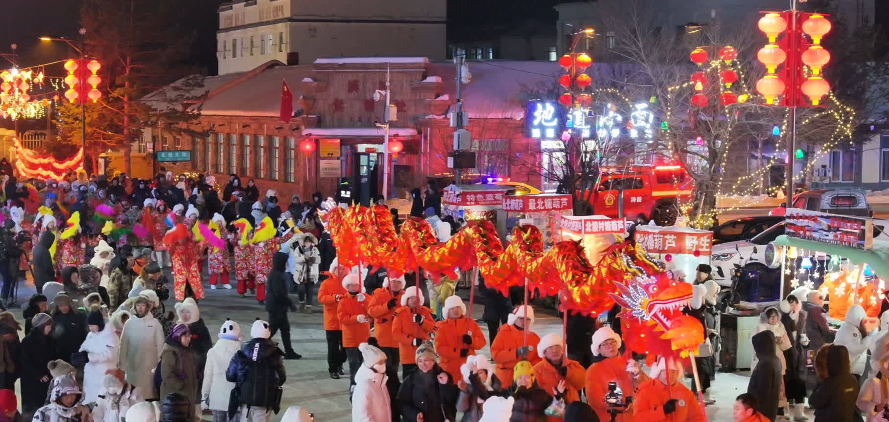 活動分為主會場漠河市北極星廣場和分會場北極鎮北極村。北極星廣場上,花燈如繁星般璀璨奪目,漠河市各單位與部門精心設計製作的花燈,融合了漠河歷史文化、生態旅遊產業發展、自身行業特色以及亞冬會等元素,造型新穎、工藝精美,引得市民和遊客紛紛駐足拍照留念。「今年的花燈很漂亮,我也拍了很多照片,一會回家發個朋友圈。」居民王旭說。