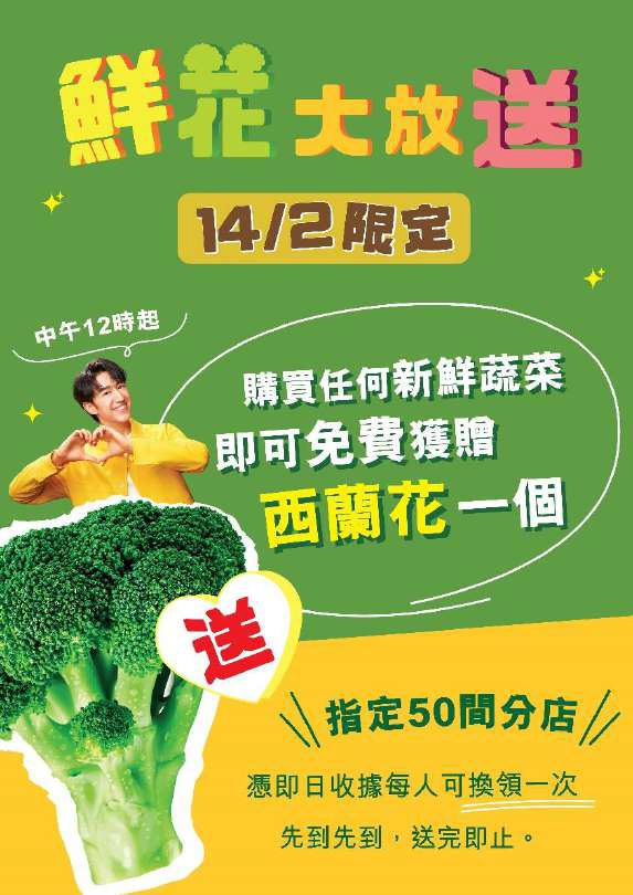 適逢2月14日情人節,惠康當日中午12點起於18區50間指定分店,大派合共8,000個西蘭花,顧客凡購買新鮮蔬菜即有機會免費獲贈西蘭花乙個,齊齊分享快樂能量,全因大家「咁『鮮』係一家人」,萬勿錯過!數量有限,送完即止。