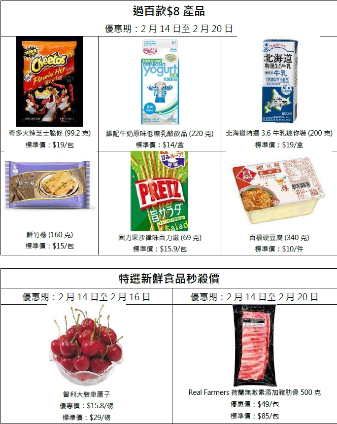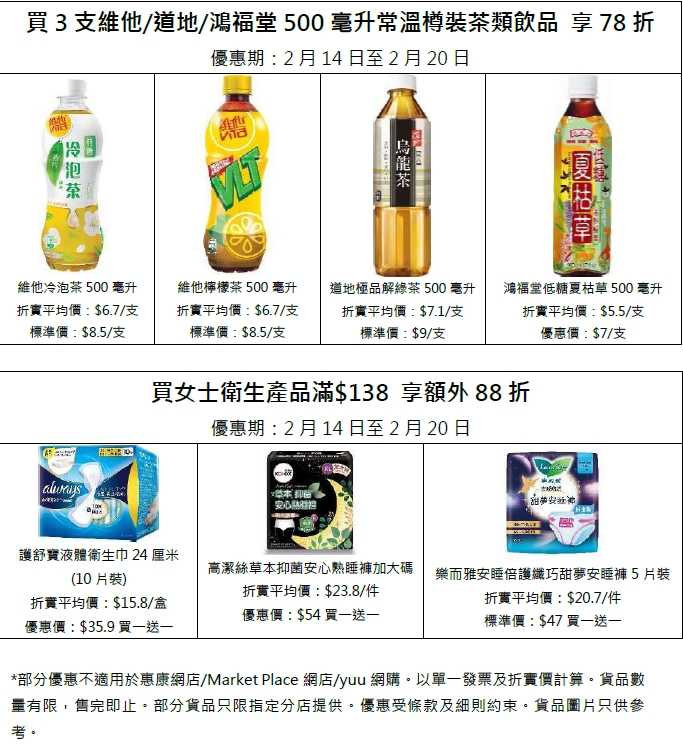 由2月14日至2月20日,惠康破天荒連推6大激筍優惠,包括過百款$8產品任你揀、買6件單件裝雪糕或雪條8折、3支樽裝茶類飲品78折、女士衞生產品買滿$138享額外88折及新鮮蔬菜買滿$38即享88折,貼心涵蓋多個種類,貨品均以新低價發售!惠康網店更每日大派$80電子優惠券!