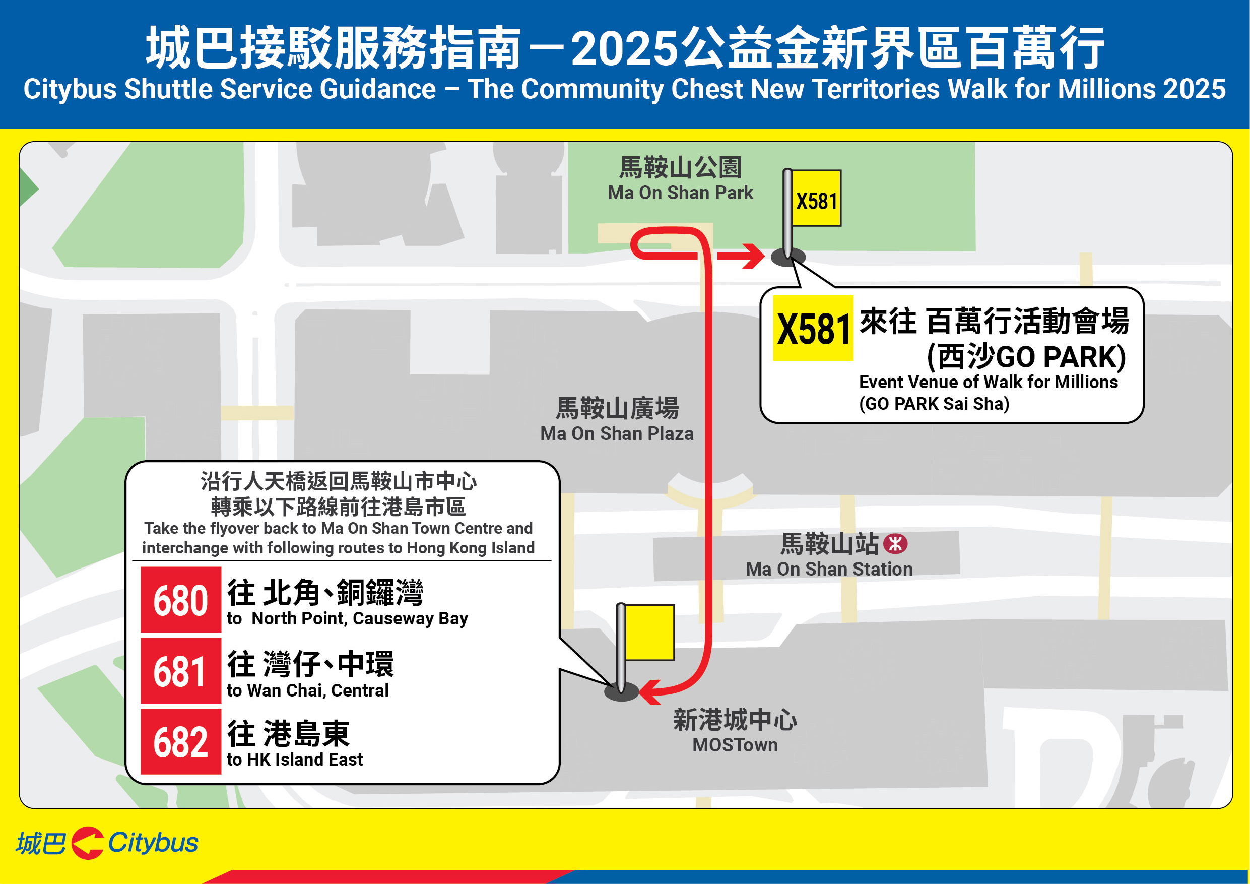 城巴早前成功贏得十四鄉的專營巴士路線經營權,開辦「馬鞍山·西沙」網絡。在得悉公益金新界區百萬行急需免費交通支援後,便建議開辦特別接駁路線,義載參加者及工作人員前往會場,為唯一支援該項活動交通服務的公共交通機構,同時提供581及582號線兩條路線,來往馬鞍山市中心/大學站及西沙GO PARK。