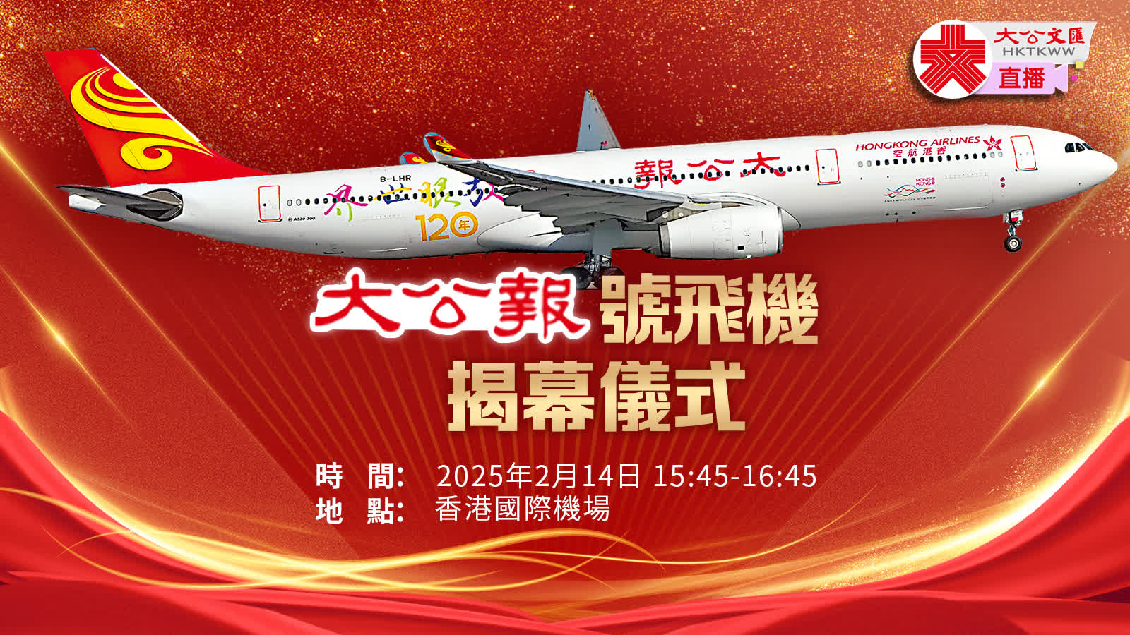 香港大公文匯傳媒集團與香港航空攜手打造的「大公報」號A330彩繪客機將於今日(14日)正式揭幕!詳見:「大公報」號飛機周五揭幕 翱翔天際