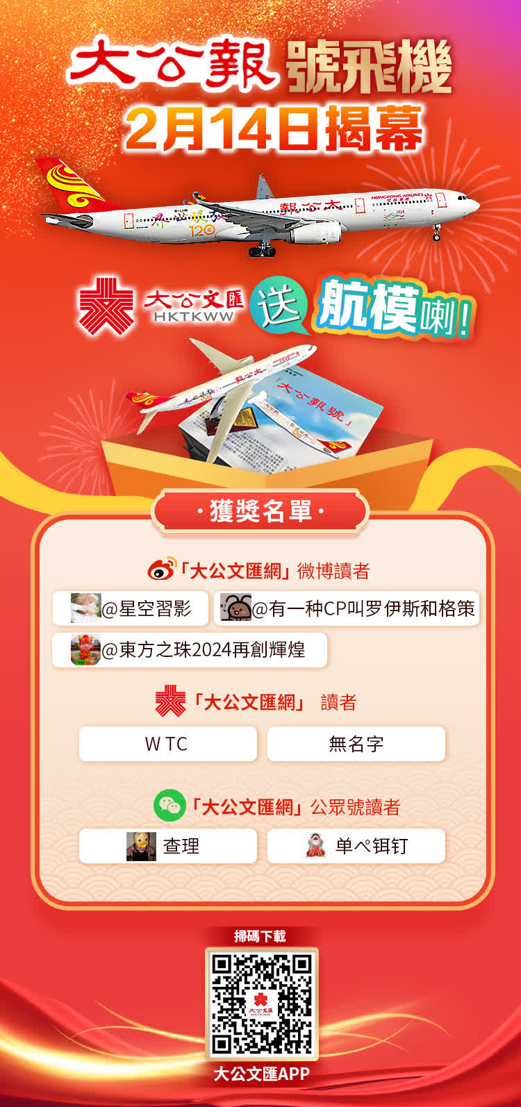 下載大公文匯APP,掃描下方二維碼,在大公文匯網官方微博收看「大公報」號飛機揭幕儀式直播,關注+轉發+評論三連,我們將抽取兩位幸運讀者,送出「大公報」號航模各一份!