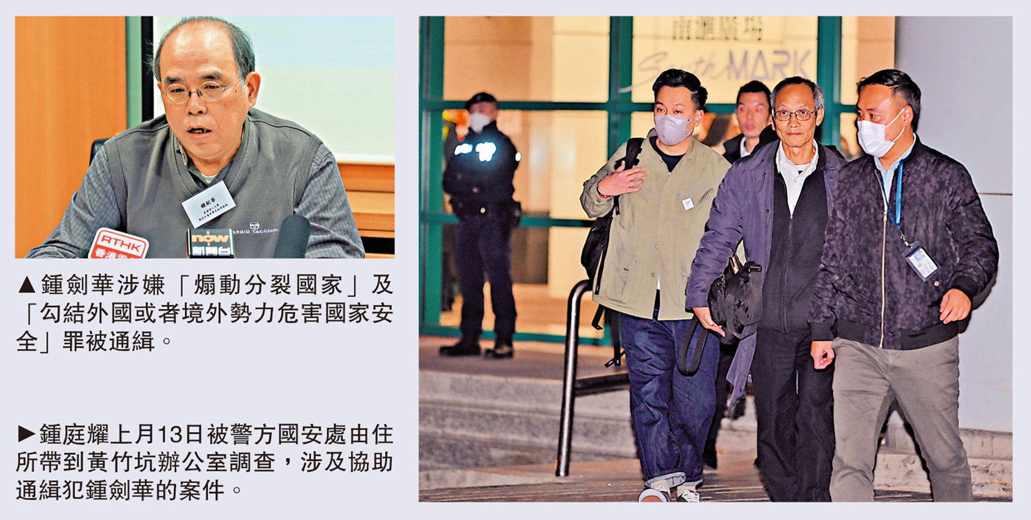 鍾庭耀早前兩次被警方國安處人員帶走,懷疑其協助在逃人士鍾劍華,又帶鍾庭耀到民研辦公室作進一步調查。鍾劍華曾任民研副行政總裁,去年12月被警方國安處通緝,指鍾劍華涉及煽動分裂國家罪和勾結外國或者境外勢力危害國家安全罪。