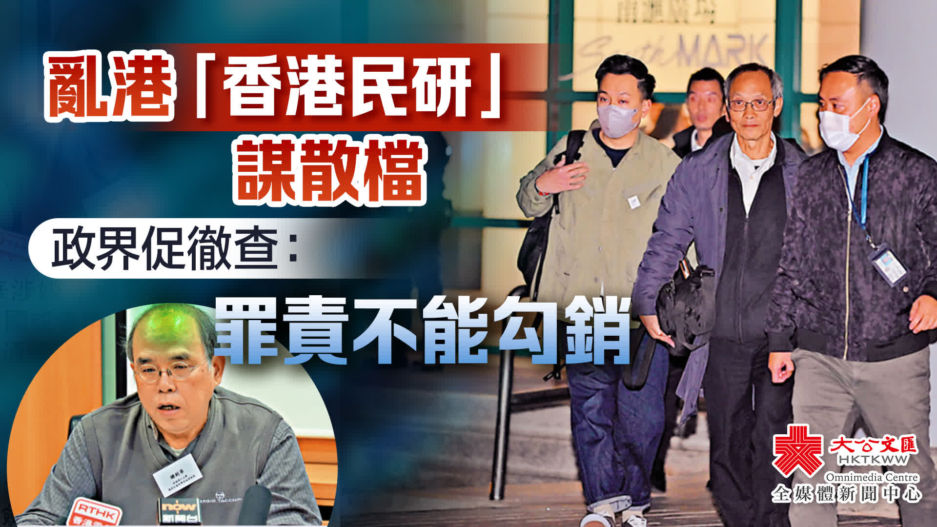 有政界人士指出,民研過往以「學術研究」為名,實則進行政治操弄,煽動社會情緒,誤導公眾,進而擾亂香港的社會穩定和損害國家利益,如今的處境可謂咎由自取。他們說,民研退場不代表過去做過的事一筆勾銷,呼籲執法部門繼續深入調查,如發現曾違法必須嚴懲。