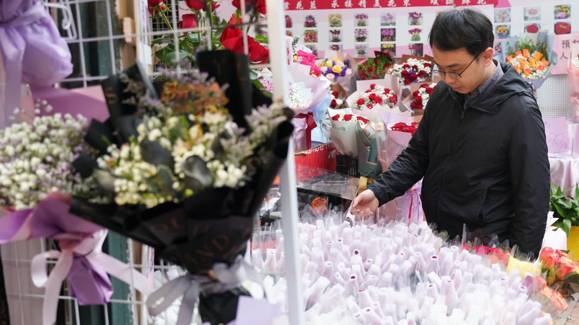 大公文匯全媒體報道,今日(14日)是情人節。大公文匯全媒體記者下午來到旺角花墟,各個鮮花檔口均有售賣各式玫瑰花及花束,提供眾多選擇供市民購買。