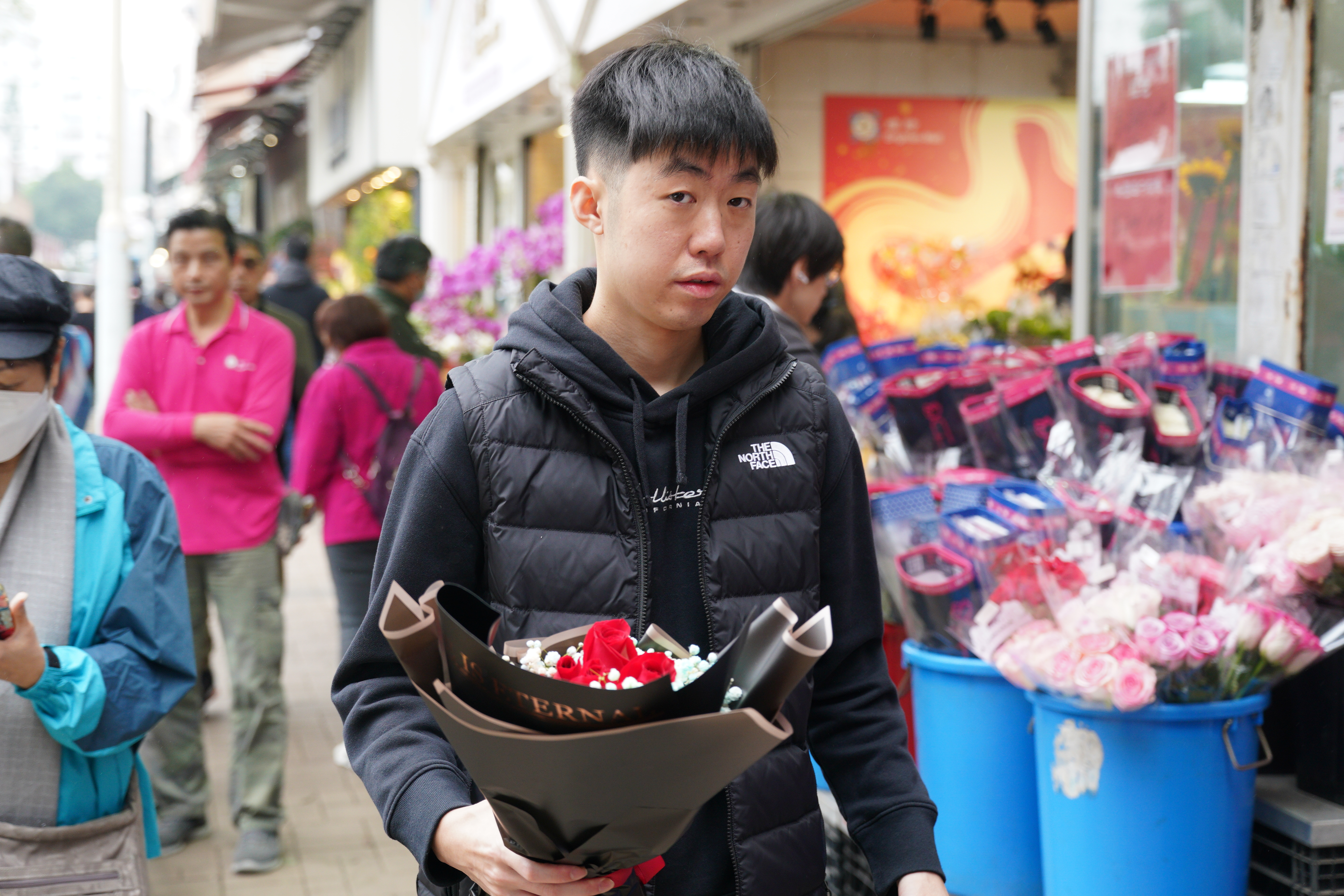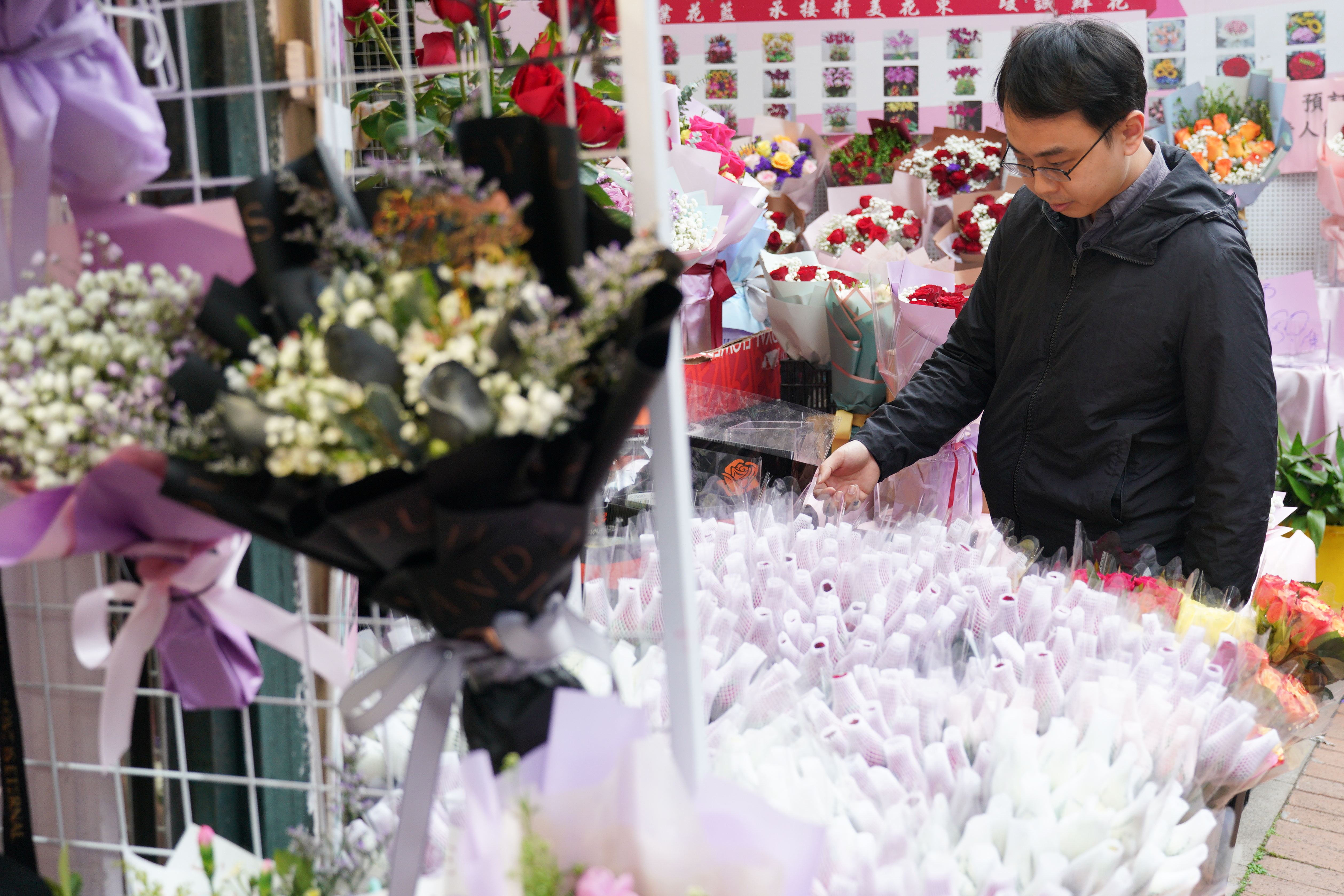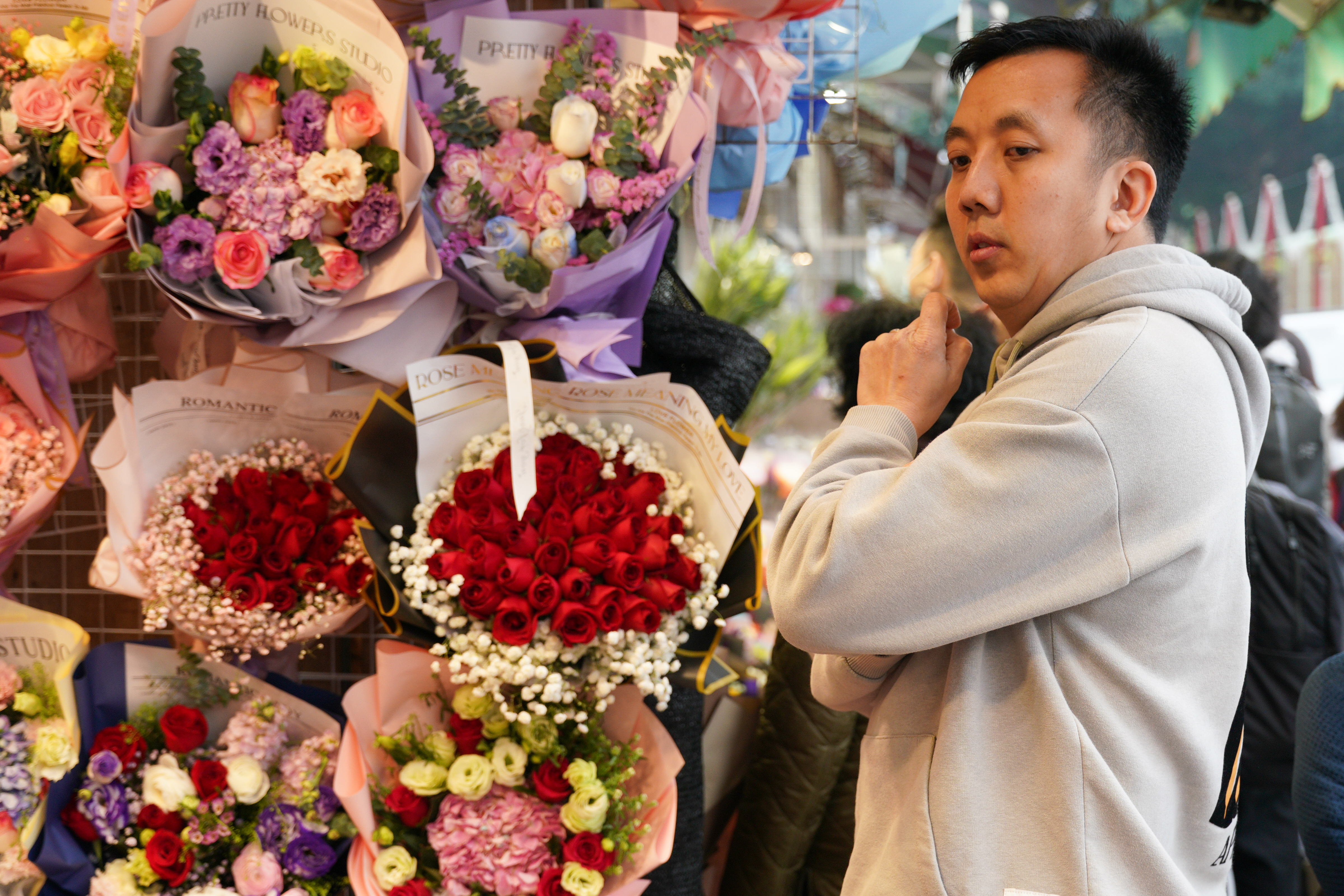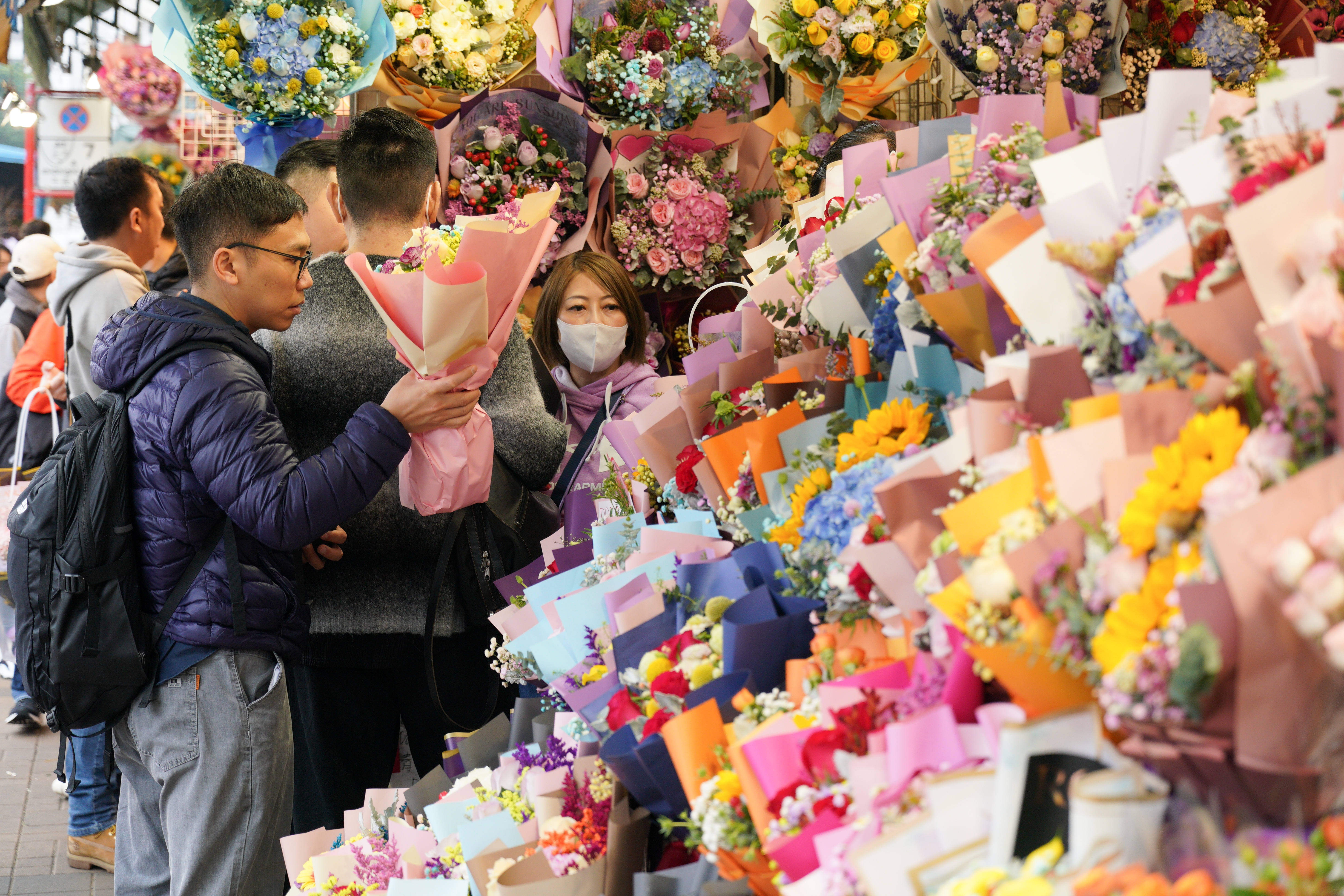 旺角花墟人流十分暢旺,其中男士居多。記者留意到,花店都將包裝好的花束放在當眼處,以紅玫瑰為主,當中更有象徵「天長地久」的99枝紅玫瑰,也有店舖推出單枝玫瑰花,包裝都同樣精美。至於花束價格,則是豐儉由人。