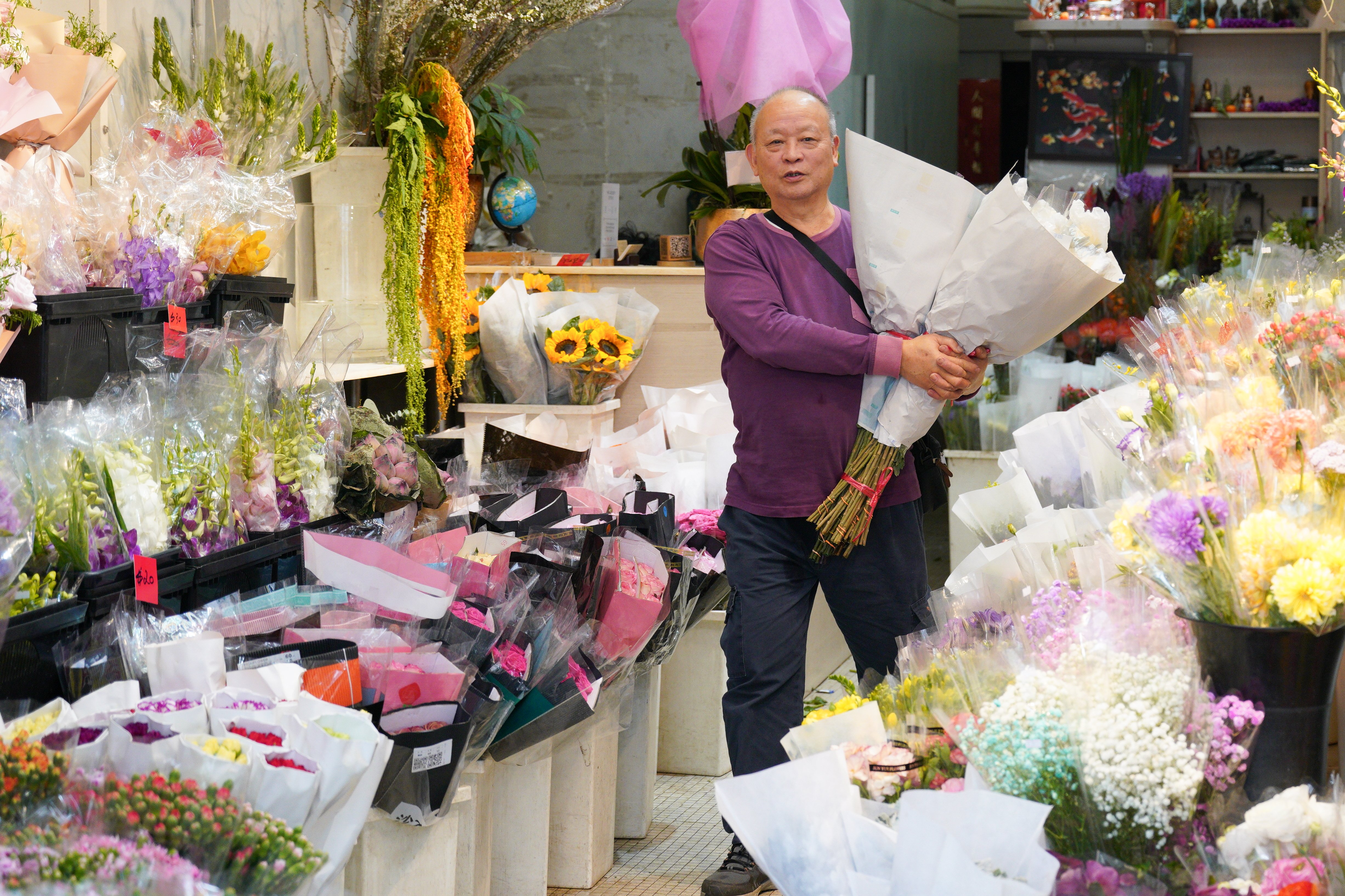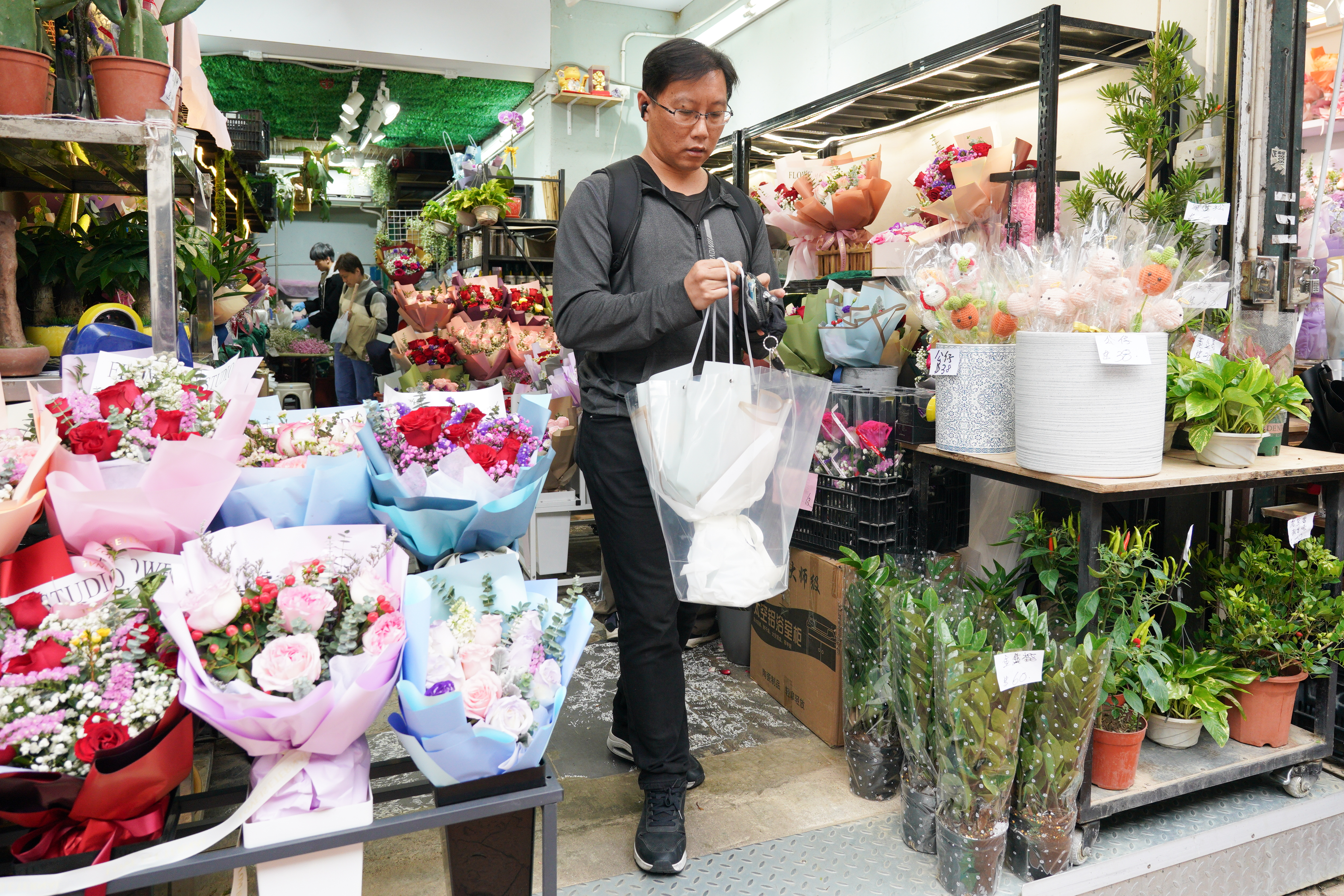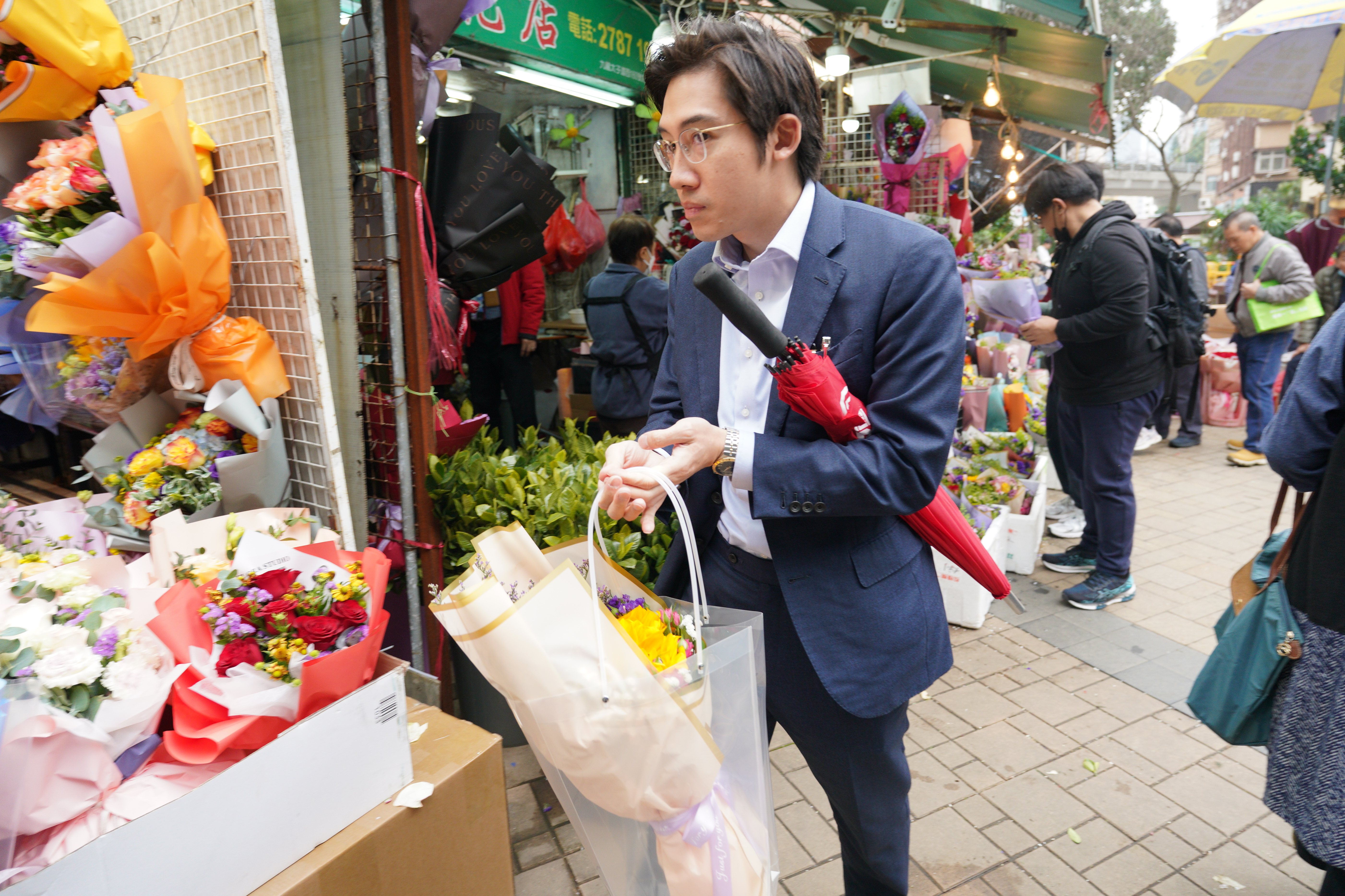 旺角花墟人流十分暢旺,其中男士居多。記者留意到,花店都將包裝好的花束放在當眼處,以紅玫瑰為主,當中更有象徵「天長地久」的99枝紅玫瑰,也有店舖推出單枝玫瑰花,包裝都同樣精美。至於花束價格,則是豐儉由人。