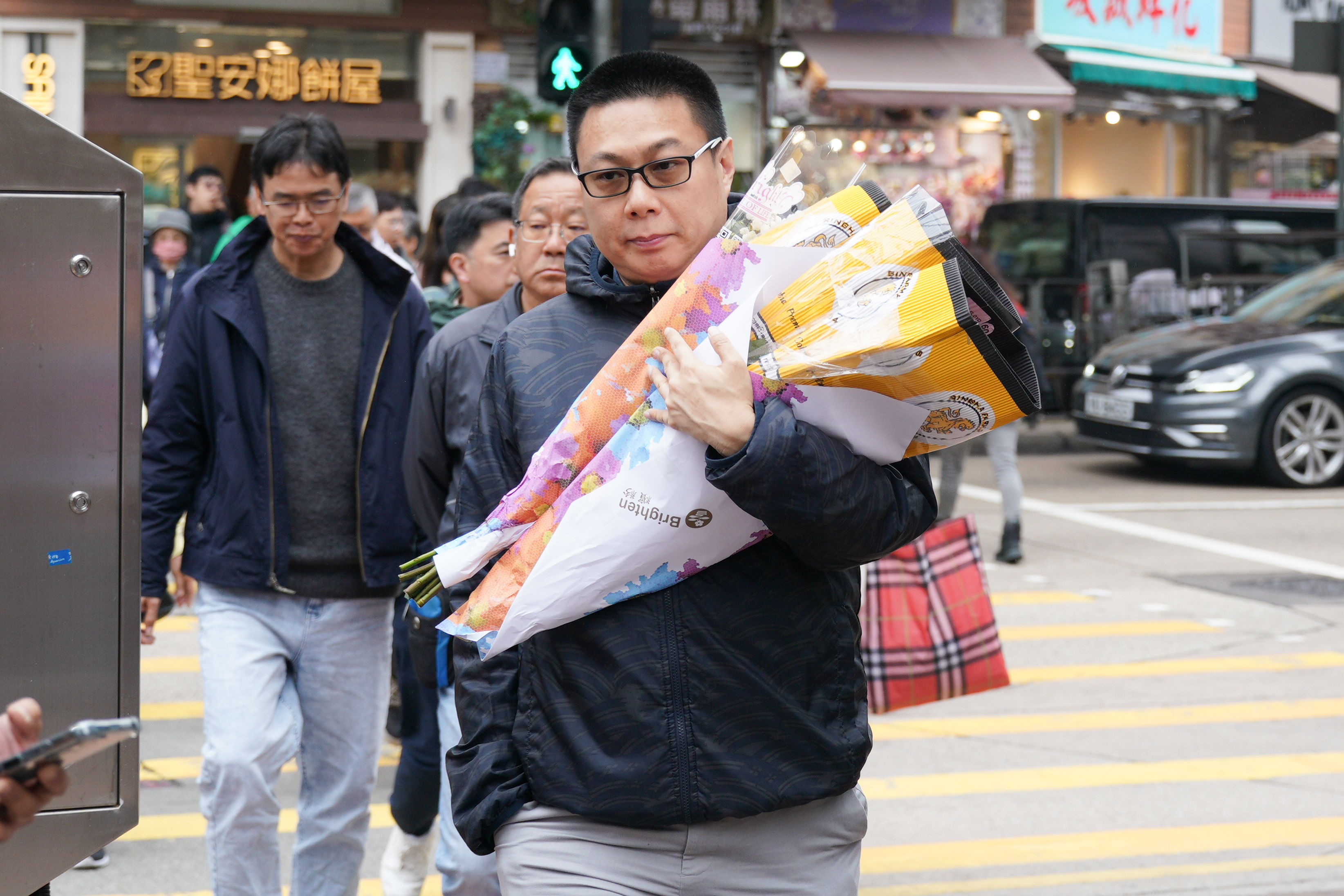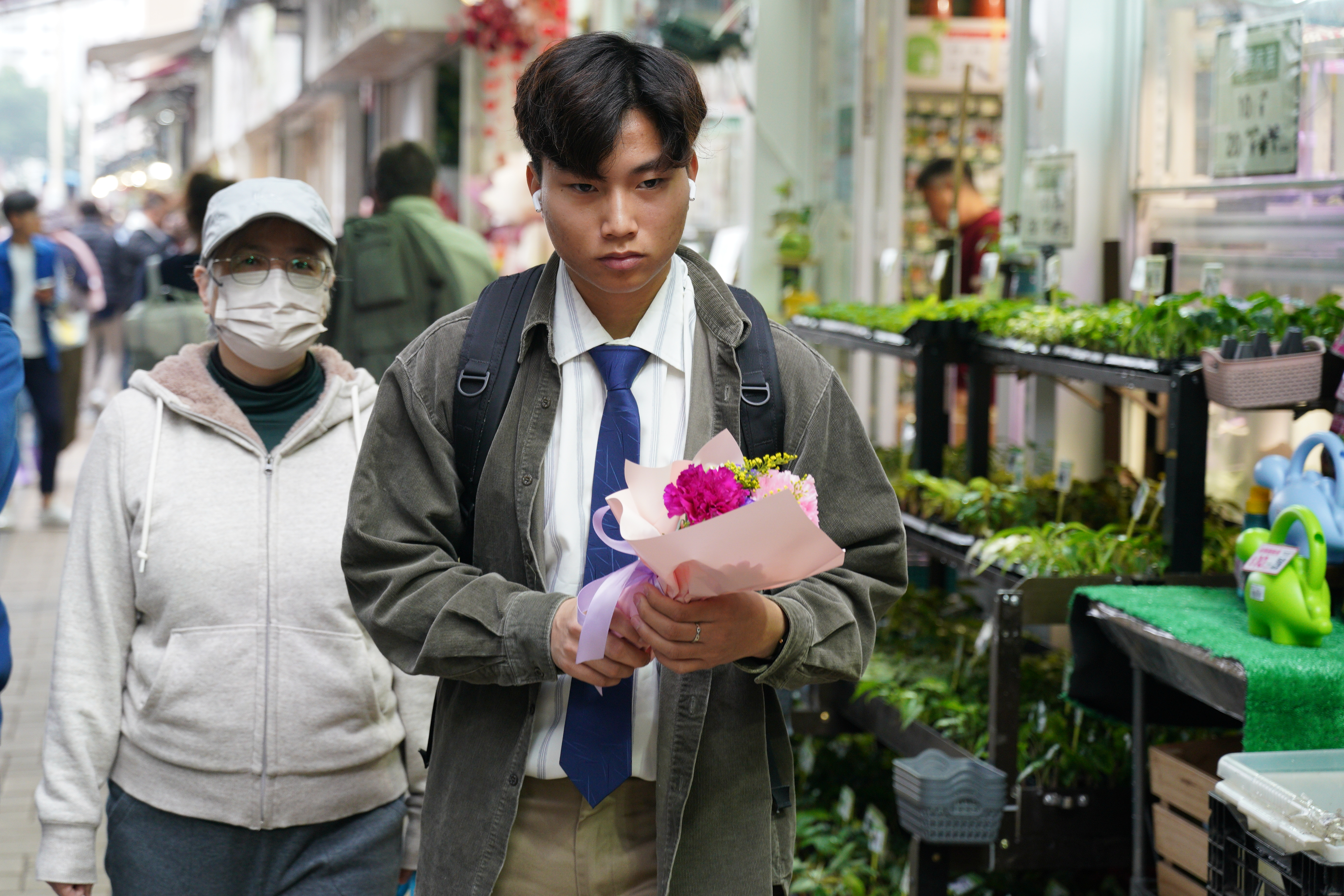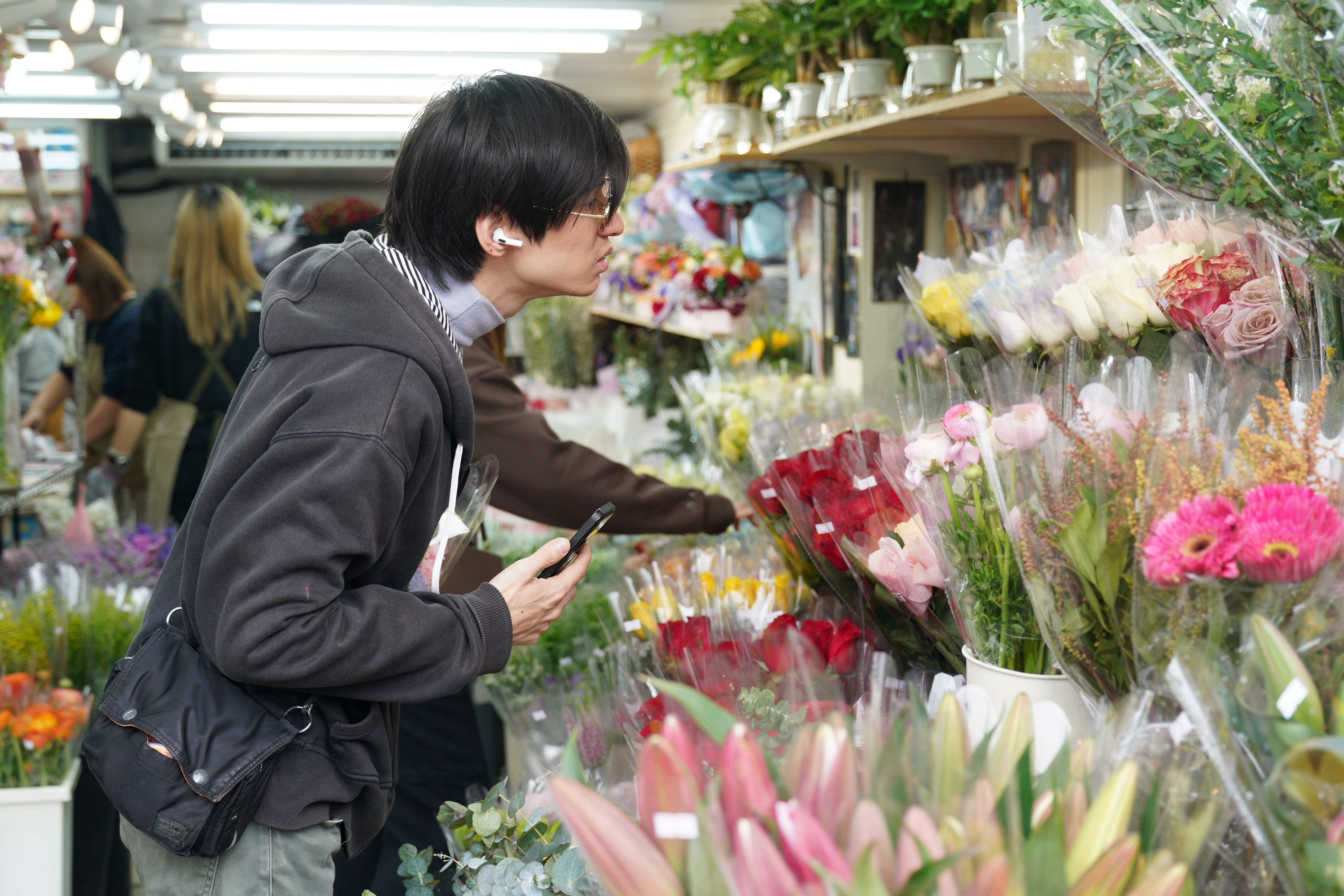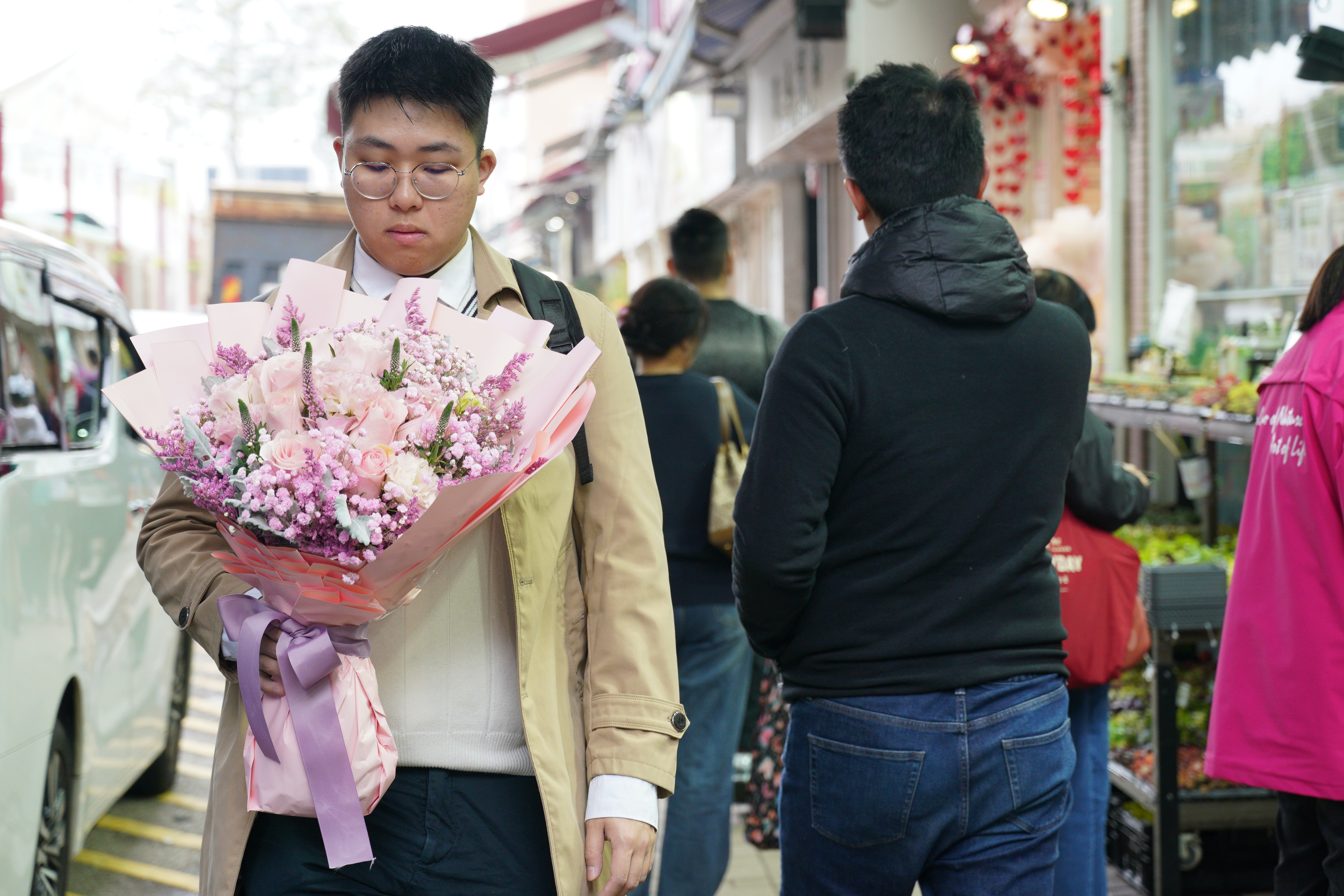 旺角花墟人流十分暢旺,其中男士居多。記者留意到,花店都將包裝好的花束放在當眼處,以紅玫瑰為主,當中更有象徵「天長地久」的99枝紅玫瑰,也有店舖推出單枝玫瑰花,包裝都同樣精美。至於花束價格,則是豐儉由人。