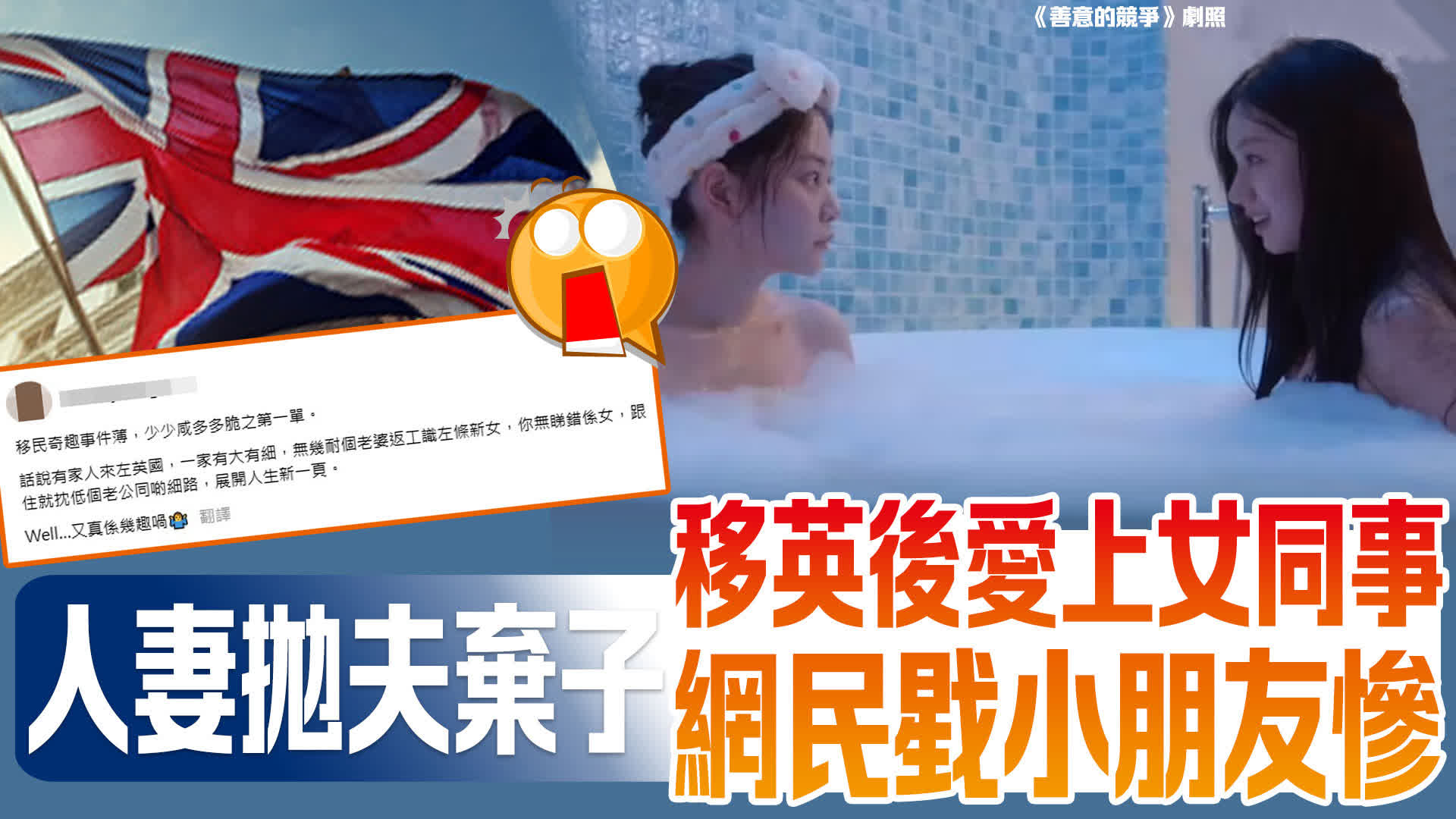 樓主在社交平台threads發文分享「移民奇趣事件簿,少少咸多多脆之第一單」,稱有一個香港家庭移民英國,家庭成員「有大有細」,當妻子於當地入職工作後不久,認識了一位女同事,並愛上她,「跟住就抌低個老公同啲細路,展開人生新一頁」。然而,小朋友最無辜,樓主慨嘆「大人揀咗,細路仔要硬食」。