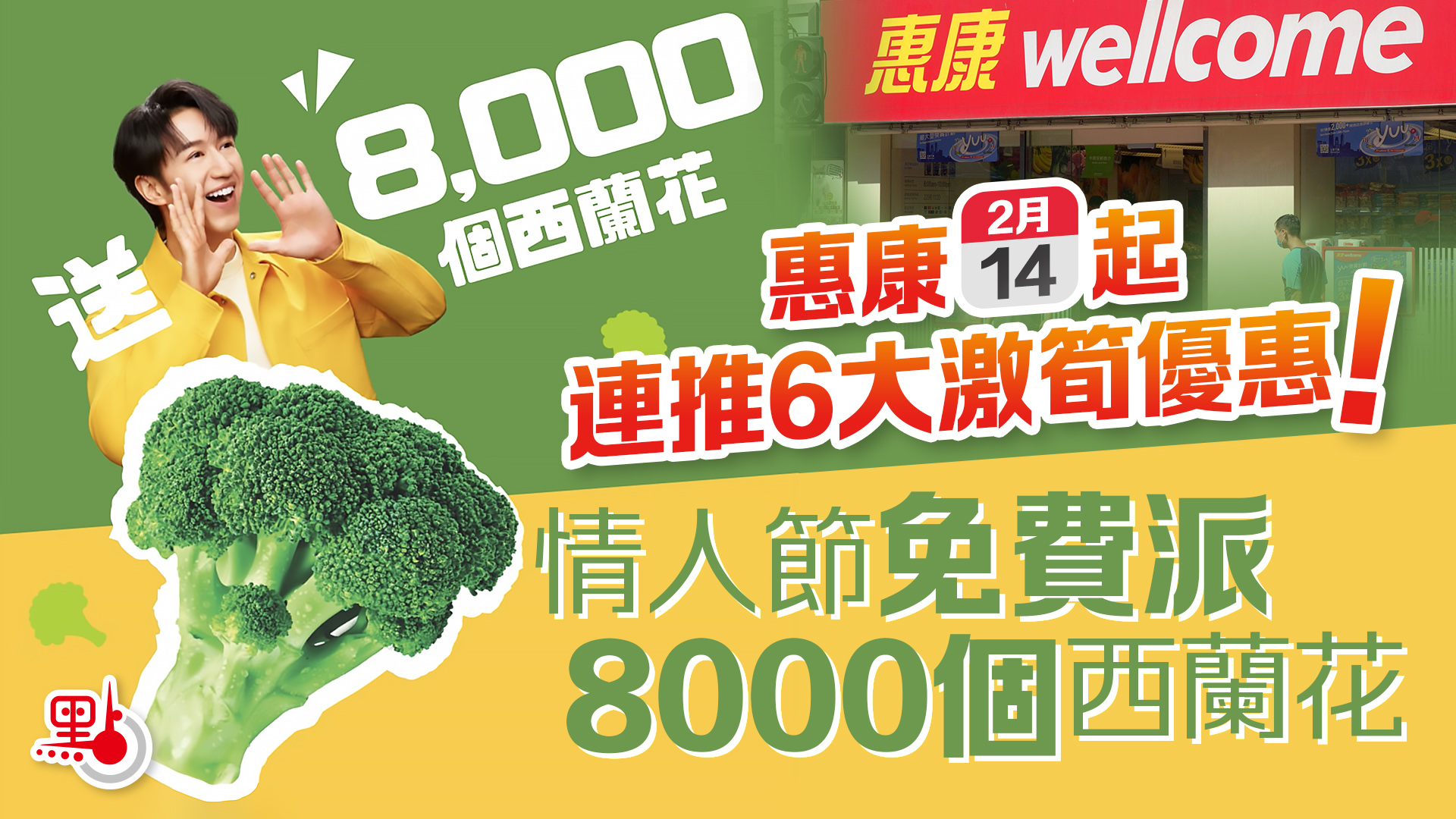 適逢2月14日情人節,惠康當日中午12點起於18區50間指定分店,大派合共8,000個西蘭花,顧客凡購買新鮮蔬菜即有機會免費獲贈西蘭花乙個,齊齊分享快樂能量,全因大家「咁『鮮』係一家人」,萬勿錯過!數量有限,送完即止。