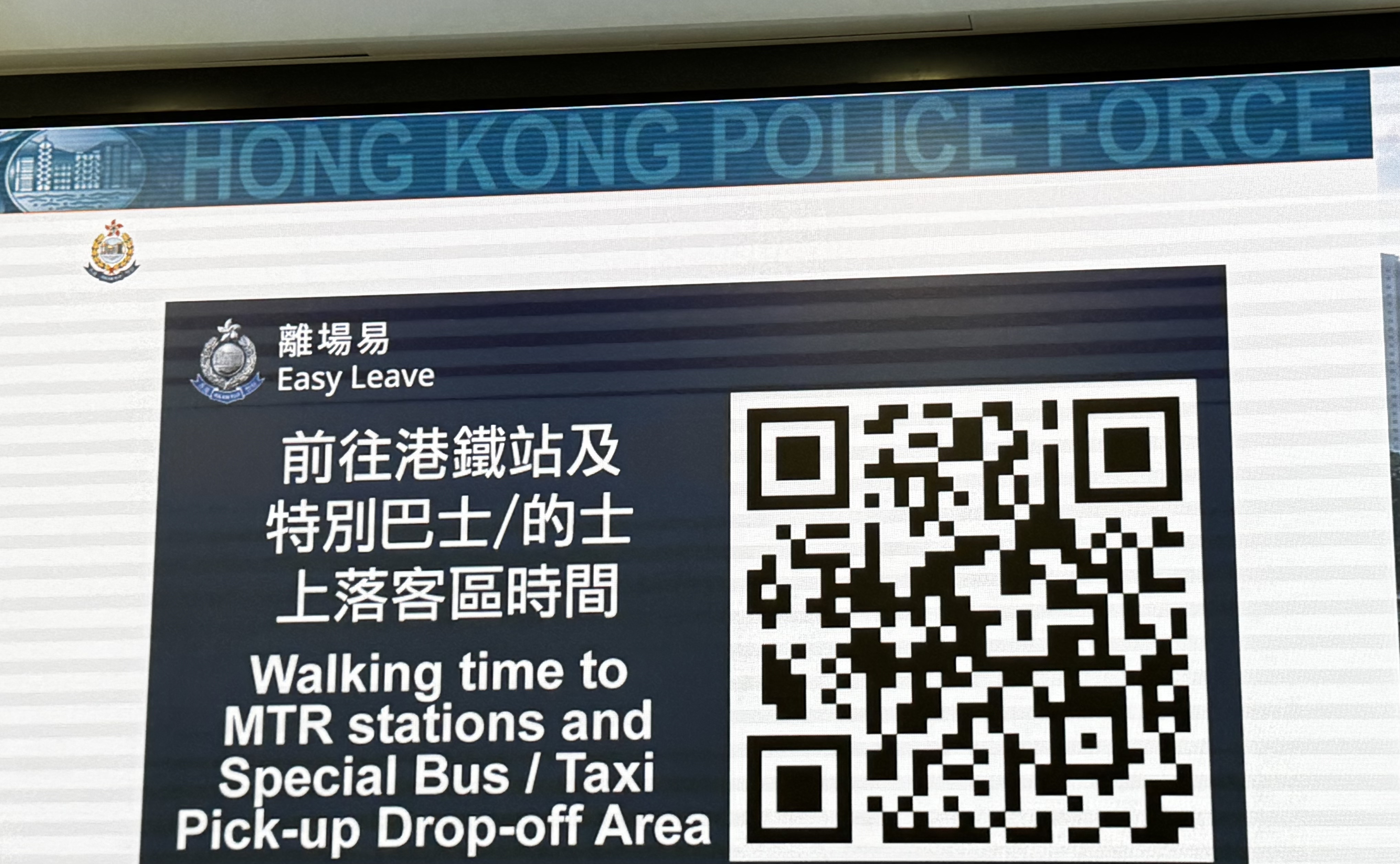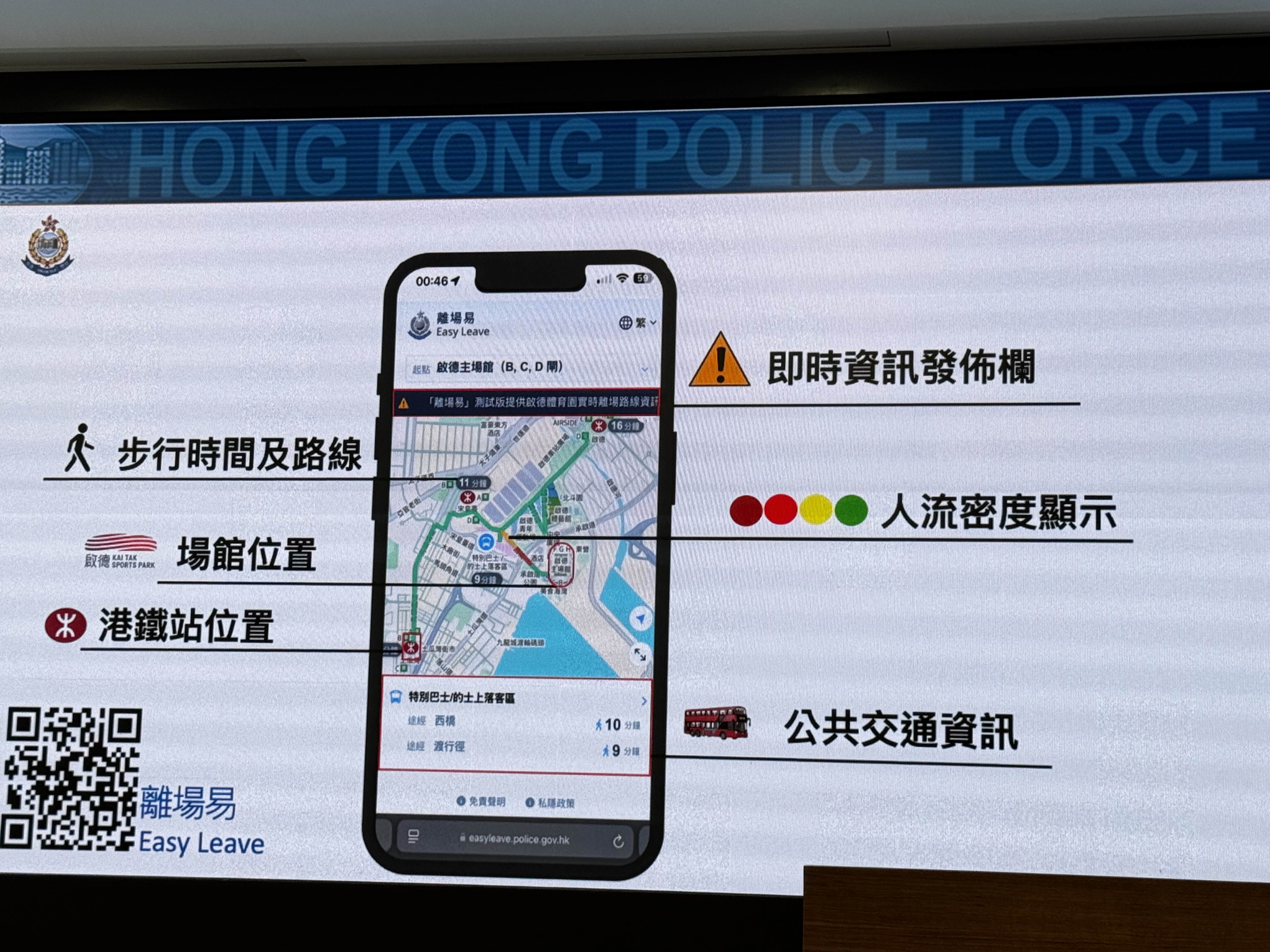掃描「離場易」二維碼即可開啟啟德周邊地圖,內含訊息包括公共交通資訊、人流密度顯示、即時資訊、步行時間及路線以及港鐵站位置,便於觀眾查看周邊交通情況,以快速找到最便利自己的離場出行方式。