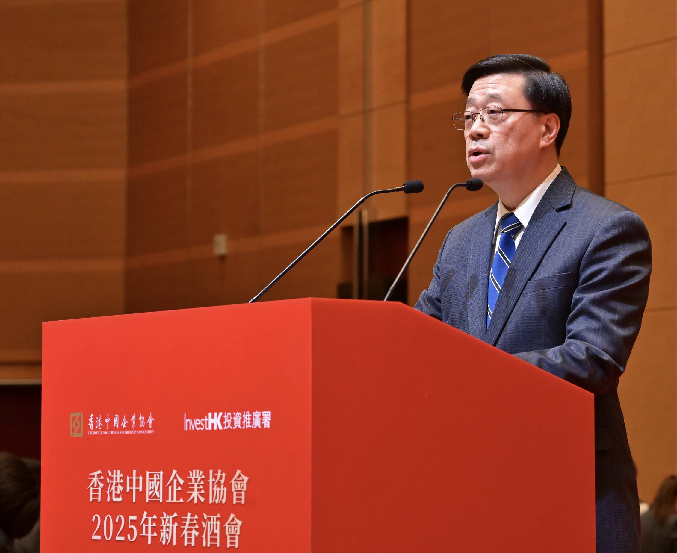 李家超致辭時感謝中企協會一直團結中資企業貢獻香港經濟,並在不同領域服務社會。在新一年,特區政府會繼續勇於改革、創新破局,鞏固香港穩定發展的良好態勢,並持續推動大灣區和北部都會區的發展,助力經濟增長。