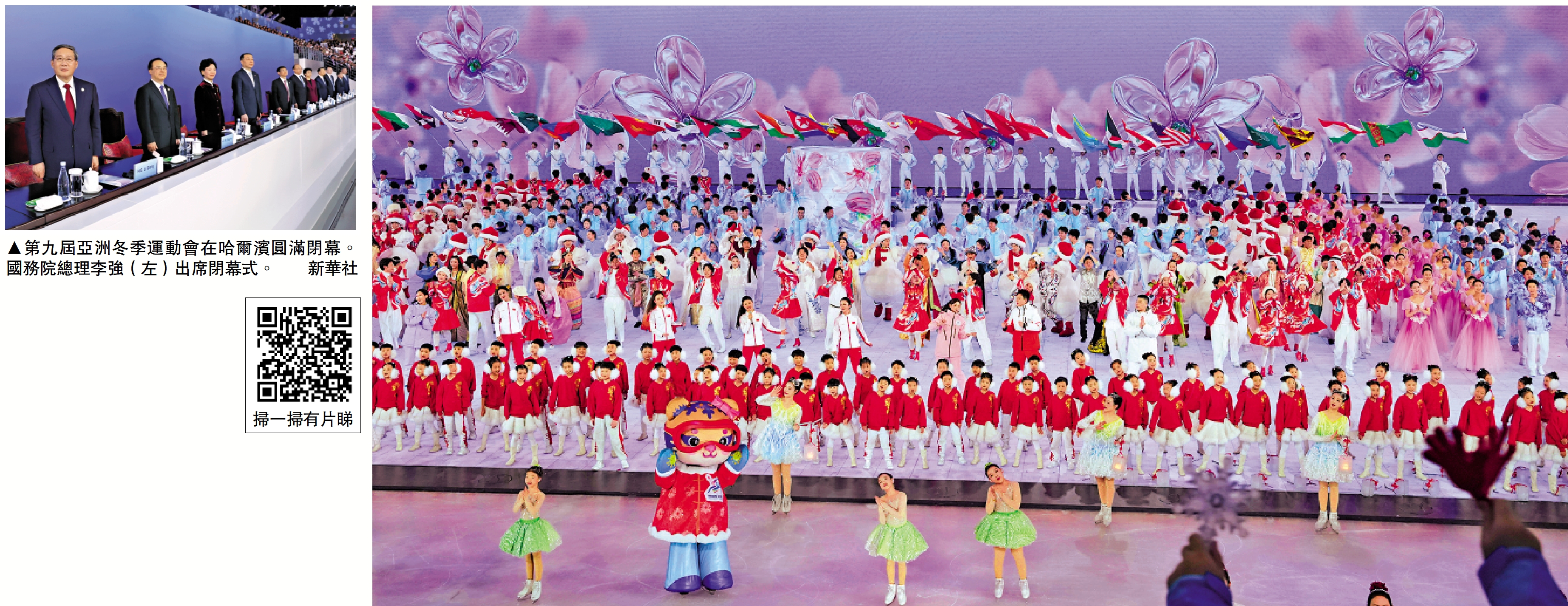 大公報報道,共築冰雪夢,共繪同心圓。第九屆亞洲冬季運動會14日晚在哈爾濱圓滿閉幕。中國國務院總理李強出席閉幕式。