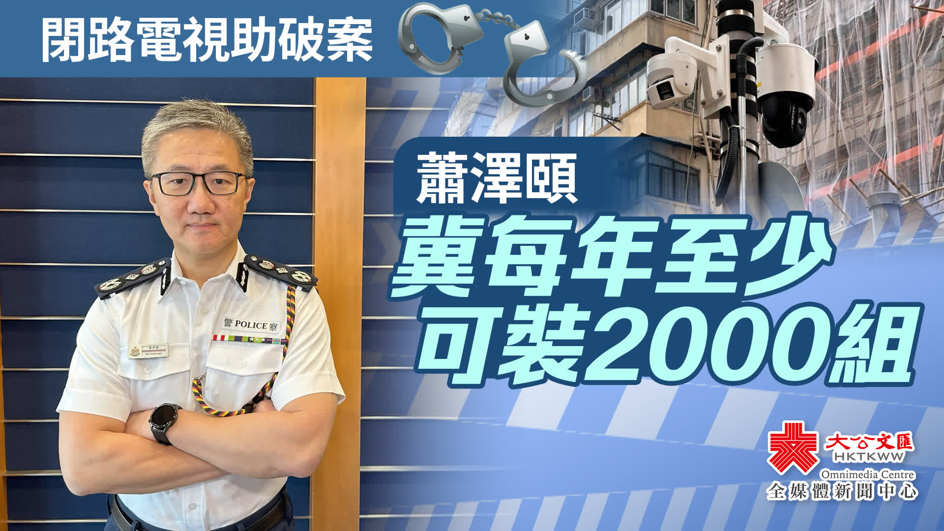蕭澤頤指出,去年破案率超過4成,比例非常高,認為是在罪案黑點安裝閉路電視的計劃帶來成效,期望未來每年可以安裝2000至2500組閉路電視。他又指,人工智能是大勢所趨,警方會研究與其他政府部門合作,有需要時可讓警方使用部門的閉路電視資料。