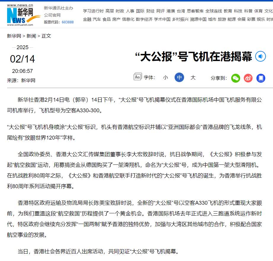 2月14日,由《大公報》與香港航空聯手打造的「大公報」號飛機,揭幕儀式在香港國際機場隆重舉行,為香港今年紀念抗戰勝利80周年系列活動揭開序幕。新華社14日報道稱,「大公報」號飛機揭幕儀式在香港國際機場中國飛機服務有限公司機庫舉行,飛機型號為空客A330-300,當日,香港社會各界近百人出席活動,共同見證「大公報」號飛機揭幕。