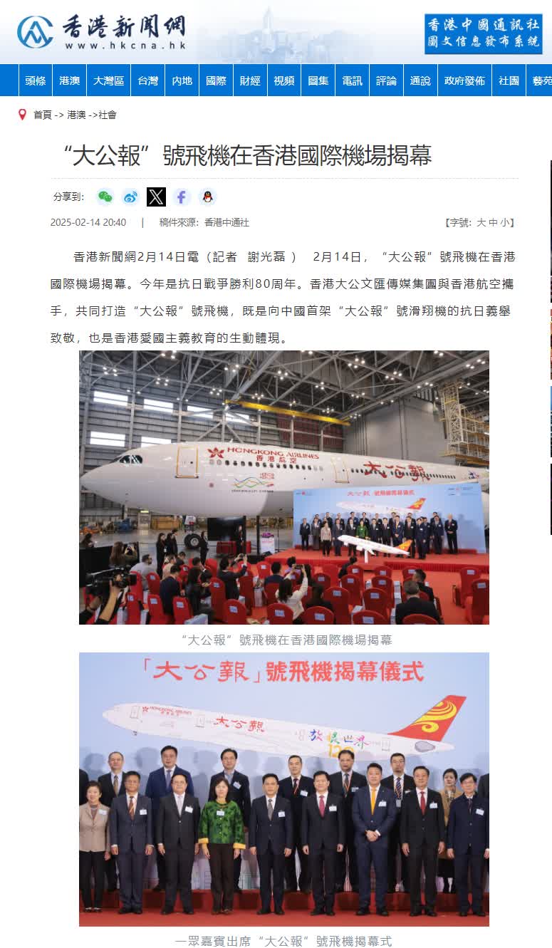 2月14日,由《大公報》與香港航空聯手打造的「大公報」號飛機,揭幕儀式在香港國際機場隆重舉行,為香港今年紀念抗戰勝利80周年系列活動揭開序幕。香港中通社當日報道稱,香港大公文匯傳媒集團與香港航空攜手,共同打造「大公報」號飛機,既是向中國首架「大公報」號滑翔機的抗日義舉致敬,也是香港愛國主義教育的生動體現。