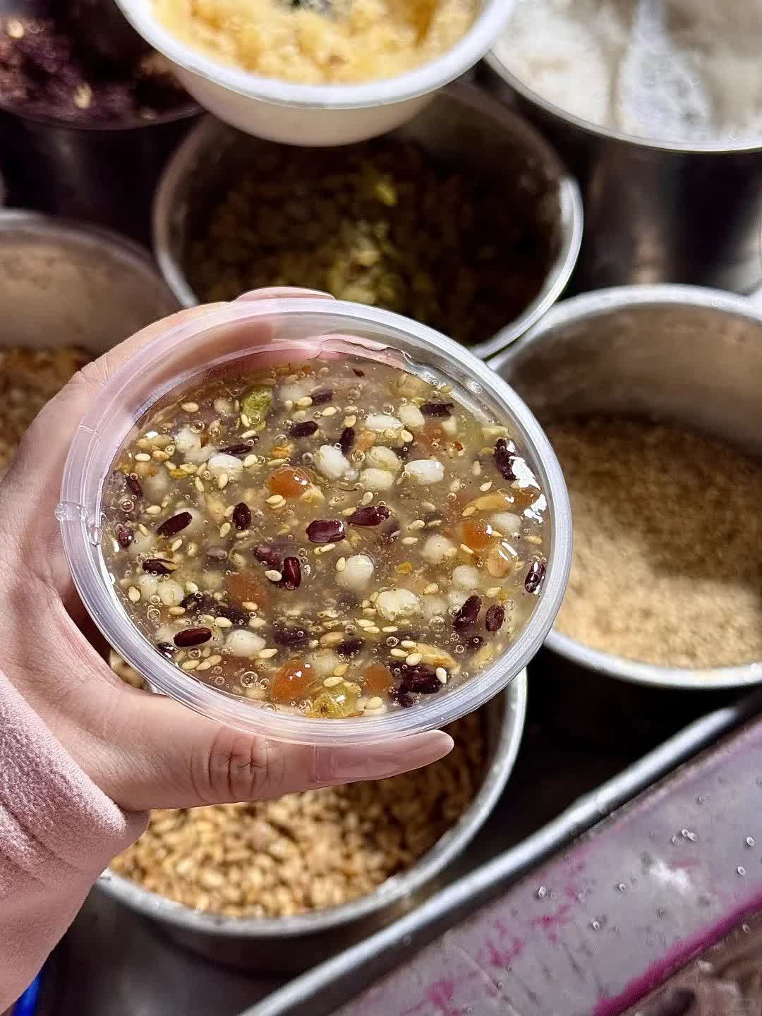 想吃「豪華版」藕粉,就嘗嘗藕粉粥。以黏稠的藕粉為底,加入葡萄乾、枸杞薏米、黑芝麻、花生等小料,最終得到一碗如同八寶粥一般豐富的藕粉粥。