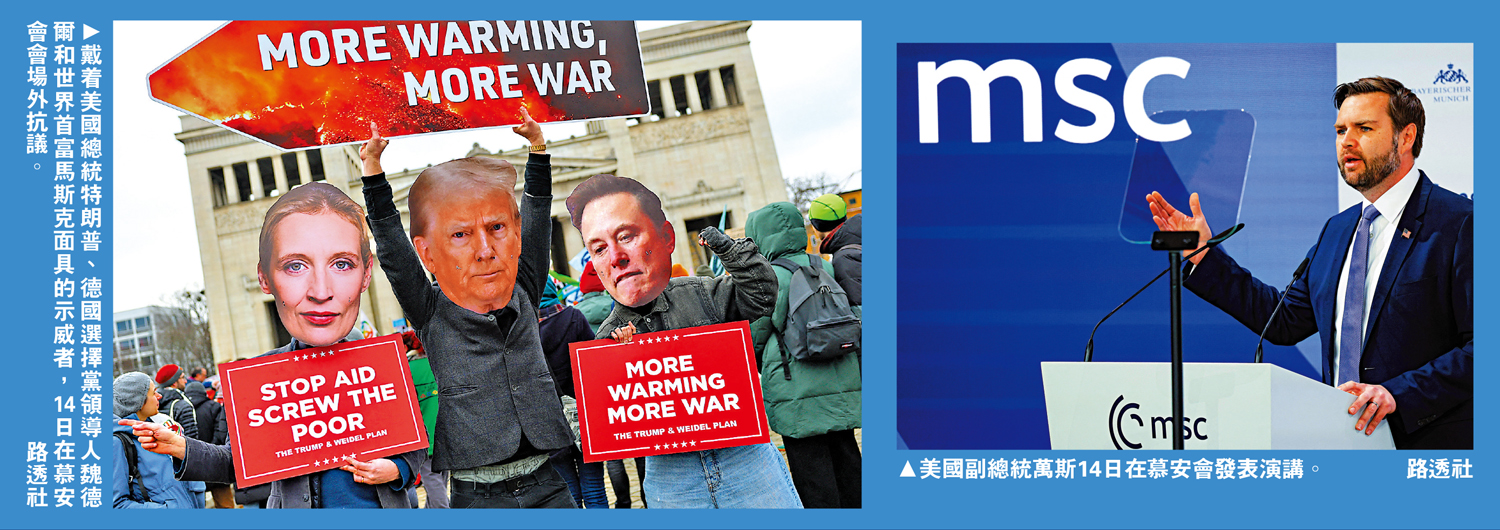 大公報報道,美國副總統萬斯14日在德國慕安會發表演講,大肆向歐洲「開炮」,指歐洲最大的威脅不是來自外部,而是來自歐洲內部,又批評歐洲壓制言論自由,移民問題已失控,「背棄基本價值觀」。這番言論引發現場一片嘩然,多名德國官員面露不悅。演講結束後,萬斯與德國極右翼選擇黨領導人魏德爾私下會面,再次震驚德國政壇。分析稱,本次慕安會被視為特朗普2.0在歐洲的「首秀」,萬斯這一「下馬威」凸顯美歐無法掩蓋的分歧。