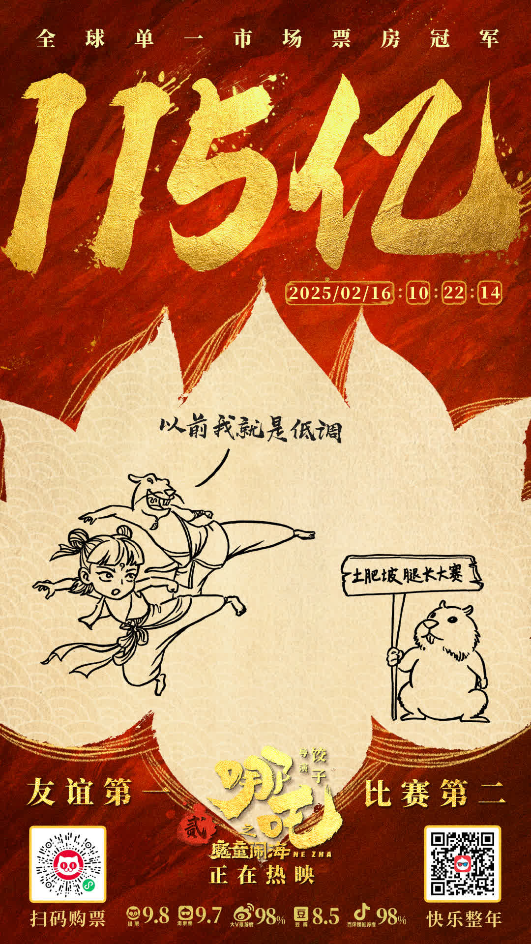 (大公文匯網記者 馬曉芳 北京報道)恰逢情人節和周末假期,《哪吒之魔童鬧海》的總票房在突破100億(人民幣,下同)後,依舊漲勢不減。據貓眼專業版數據,截止2月16日10點30分,《哪吒2》總票房超115億,其中海外票房超2300萬,目前已超越《復仇者聯盟》票房,位列全球影史票房榜第11位,正向第十名《獅子王》發起追趕。同時,《哪吒2》已超越冰雪奇緣2,位列全球動畫電影票房榜第二位。