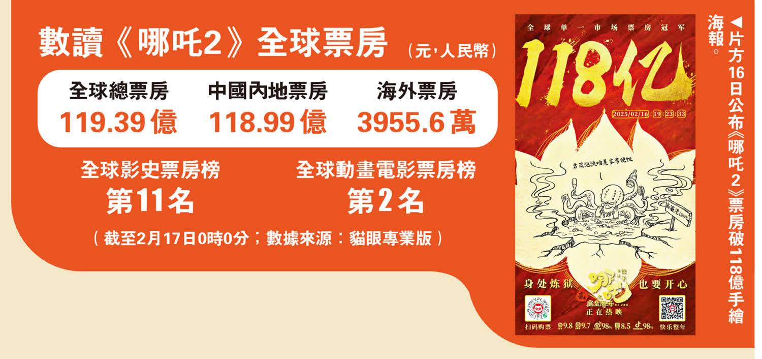 (大公報 記者 徐小惠、向芸)電影《哪吒之魔童鬧海》(下稱《哪吒2》)在剛剛過去的周末兩天又砍下14億元(人民幣,下同)票房,勢頭兇猛,預計今日就會突破120億進入全球影史票房榜前十。除了視覺效果驚艷,《哪吒2》的配音也給觀眾留下了深刻的印象,從頑劣的哪吒,到一口四川普通話的太乙真人,到複雜多變的無量仙翁,再到軟萌可愛的申小豹,這些令觀眾大呼「貼臉」的聲音背後個個有故事,體現出主創團隊精益求精的信念和對電影細節孜孜不倦的追求。