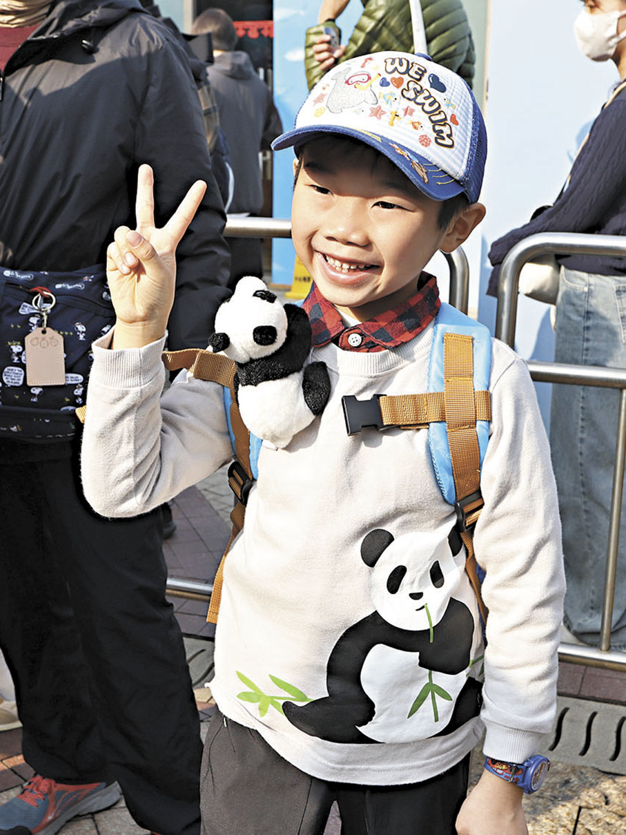 昨日不少市民帶同子女到場探望熊貓龍鳳胎,6歲的Ocean身穿大熊貓圖案的上衣,背包帶上亦夾着大熊貓造型的公仔。他表示,見到大熊貓好開心,覺得牠們毛茸茸十分可愛,並指有看到牠們吃竹子的畫面,期待再到海洋公園探望大熊貓寶寶。
