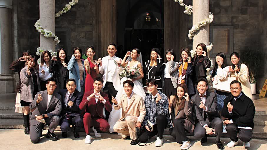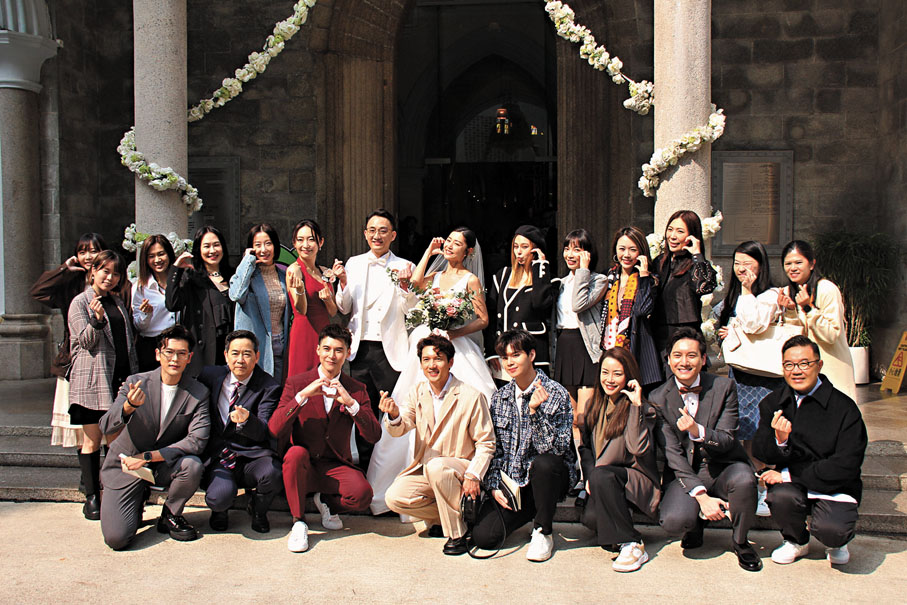 婚禮完成後,一對新人走出教堂接受賓客祝賀,他們應傳媒要求親嘴拍照,幸福滿瀉。之後一對新人陸續與親友影相留念,現場充滿快樂幸福的氣氛。