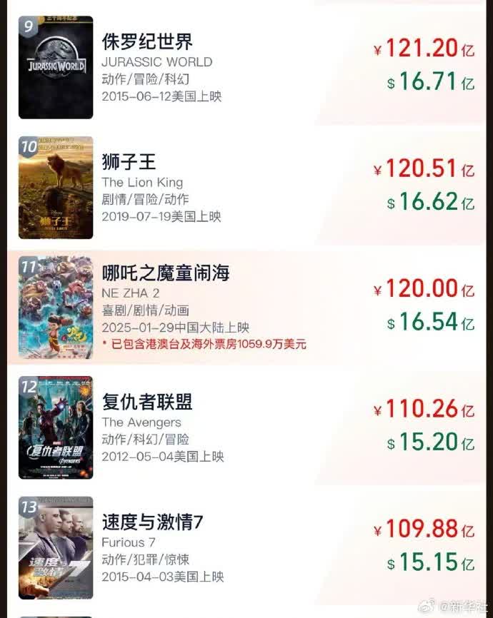 大公文匯全媒體報道,據燈塔專業版網絡數據,動畫電影《哪吒之魔童鬧海》總票房(含點映及預售)截至今日(17日)上午已經超過120億元。目前,《哪吒2》在全球票房榜排名第11,與排在前一位的《獅子王》只有約5000萬的差距。預計《哪吒2》今日稍後就會進入全球影史票房榜前十,創造新歷史。