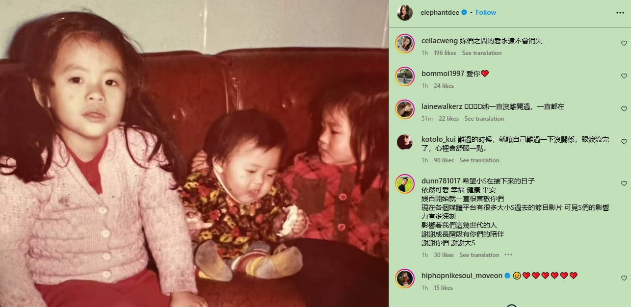 大公文匯全媒體報道,大S(徐熙媛)春節赴日旅遊期間,因流感併發肺炎病逝。小S今日(17日)在社交平台分享三姊妹兒時合照,其中坐在梳化左邊的相信是人稱「珍姐」的徐熙嫻(珍珍),在右手邊的是大S(徐熙媛),而中間的則是小S(徐熙娣)。