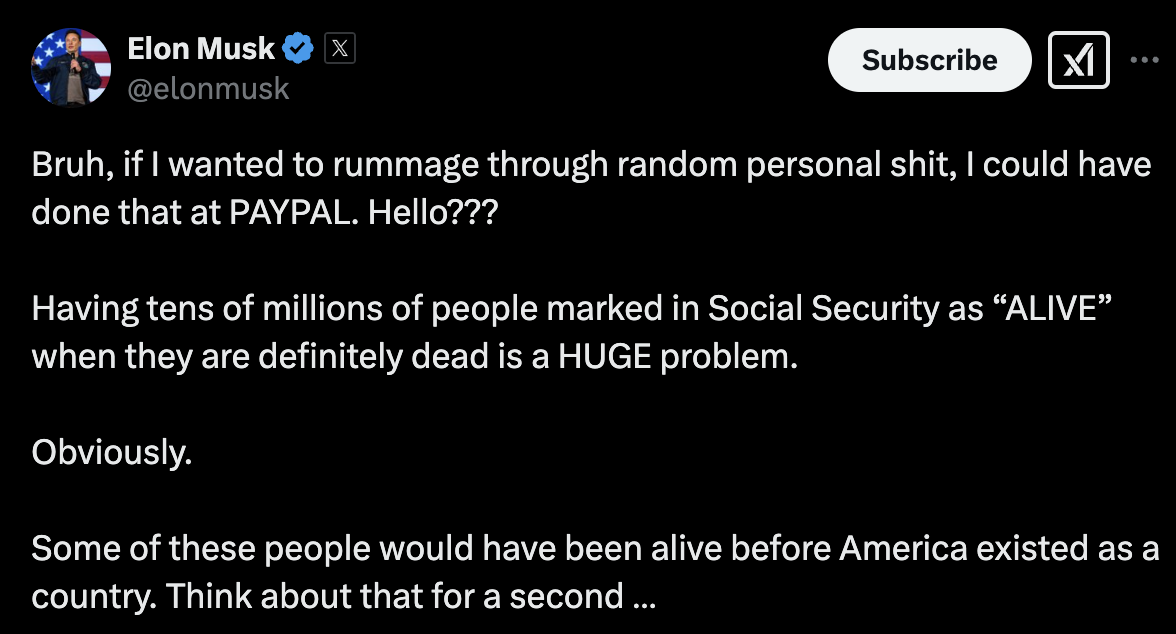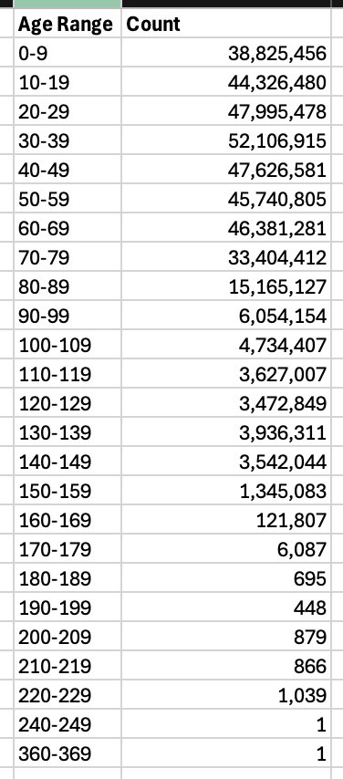 本月初,馬斯克曾指出美國社保系統向「150歲的人」支付福利,而實際情況更為離譜。他於周一公布了美國社保數據庫中「是否死亡」字段設置為否的各年齡段人數,其中暴露出兩大問題:一是總數對不上,二是年齡過於荒謬。