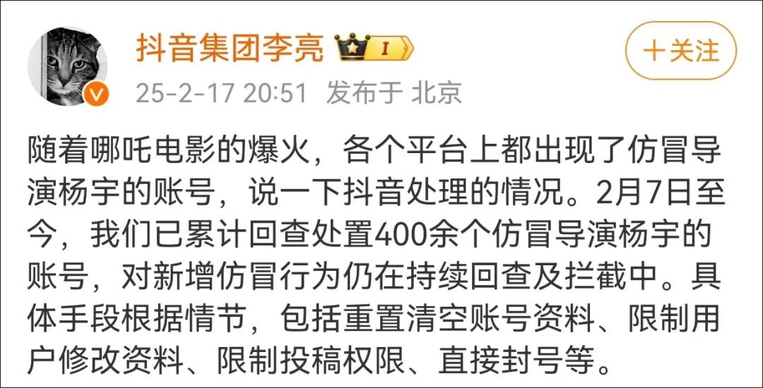 2月17日,抖音集團副總裁李亮回應網上出現多個冒充餃子導演賬號的情況。他表示,隨着《哪吒2》電影的爆火,各個平台上都出現了仿冒導演楊宇的賬號,2月7日至今,抖音已累計回查處置400餘個仿冒導演楊宇的賬號,對新增仿冒行為仍在持續回查及攔截中。具體手段根據情節,包括重置清空賬號資料、限制用戶修改資料、限制投稿權限、直接封號等。