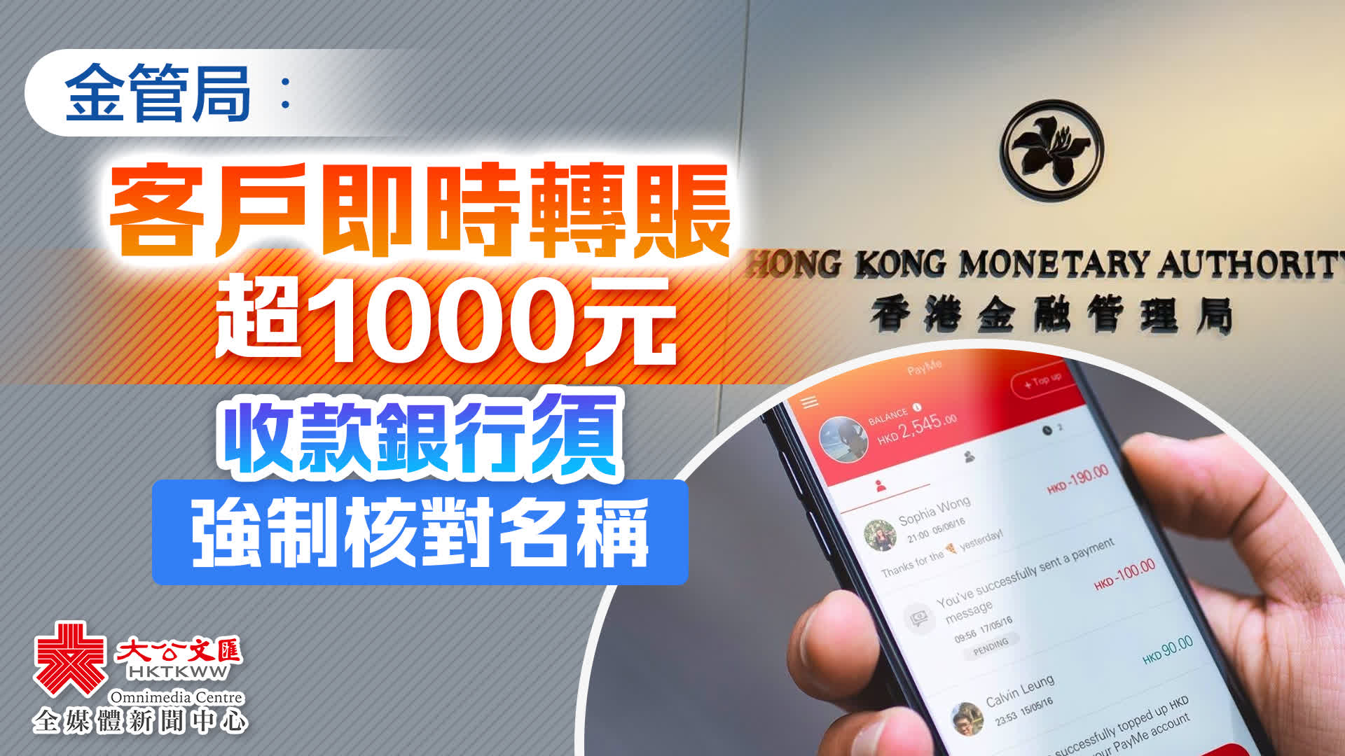 大公文匯全媒體報道,金管局今日(18日)向業界發通告,要求各銀行就客戶進行即時轉賬時,作為收款機構,倘轉賬金額高於1000元,須進行強制式名稱核對程序,並拒絕辦理無法通過強制式名稱核對程序的轉賬指示,而付款機構應通知付款人其轉賬指示不成功或被拒。當局要求認可機構應不遲於5月31日實施上述措施。
