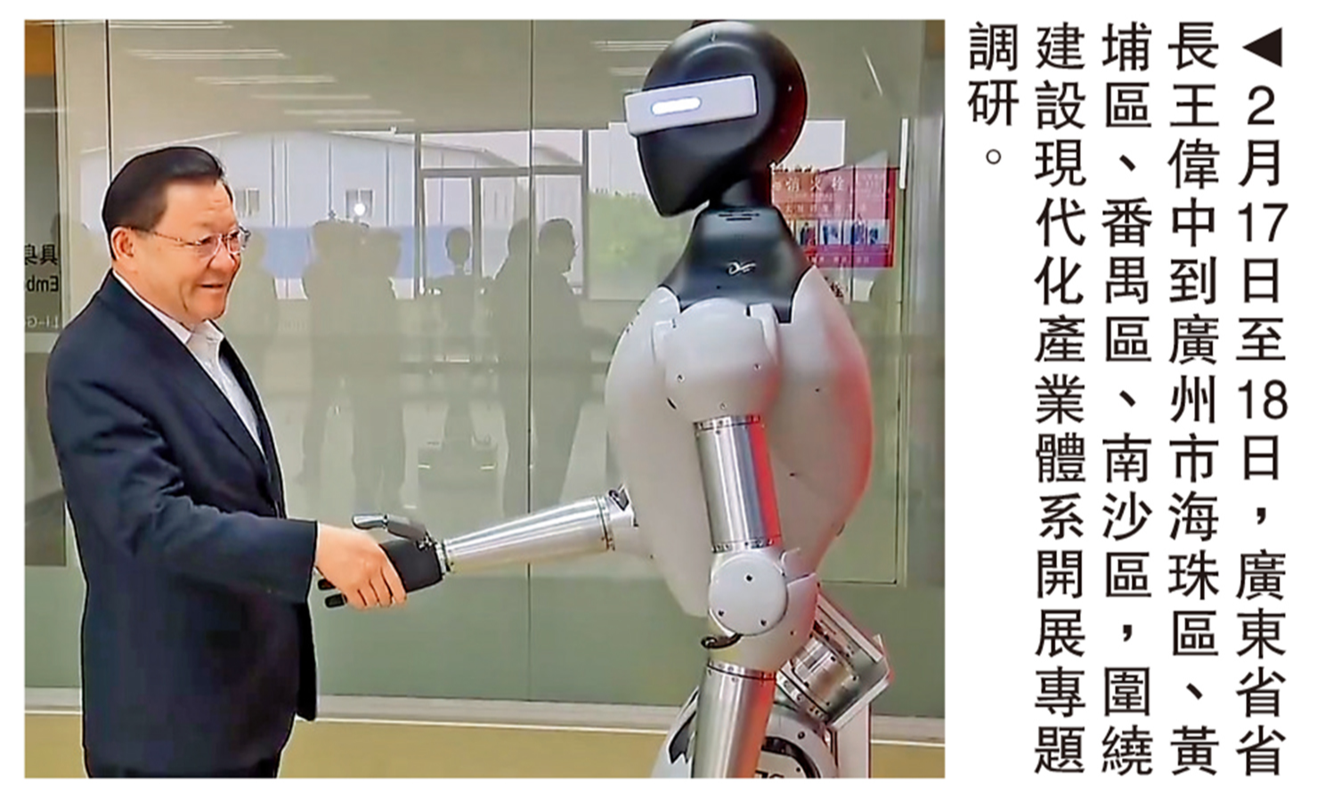 大公報據南方+報道:2月17日至18日,廣東省省長王偉中到廣州市海珠區、黃埔區、番禺區、南沙區,深入科技創新企業、新型研發機構一線,圍繞建設現代化產業體系開展專題調研。