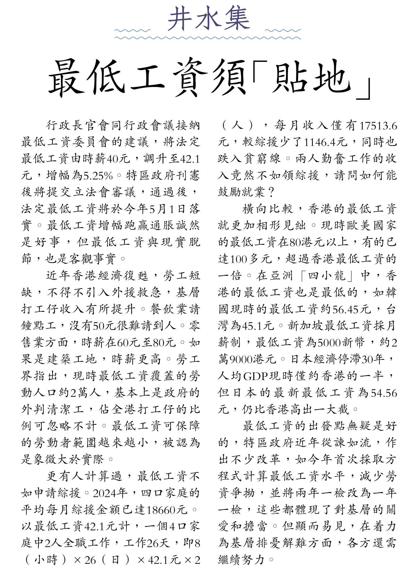 最低工資的出發點無疑是好的,特區政府近年從諫如流,作出不少改革,如今年首次採取方程式計算最低工資水平,減少勞資爭拗,並將兩年一檢改為一年一檢,這些都體現了對基層的關愛和擔當。但顯而易見,在着力為基層排憂解難方面,各方還需繼續努力。
