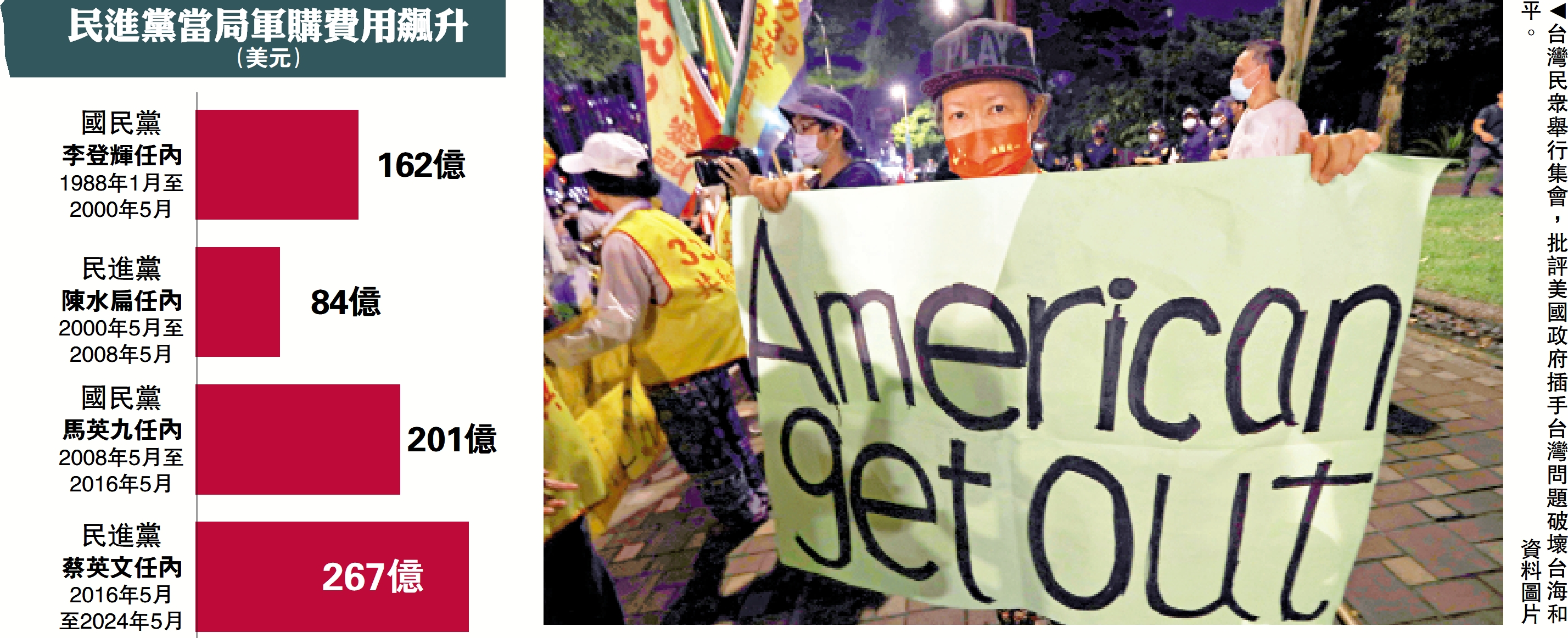 大公報綜合中通社及台媒報道,為爭取美國總統特朗普的支持,台灣當局正考慮向美國採購金額介於70億(約544億港元)至100億美元(約778億港元)的武器,表明「台灣致力於自身防務」。