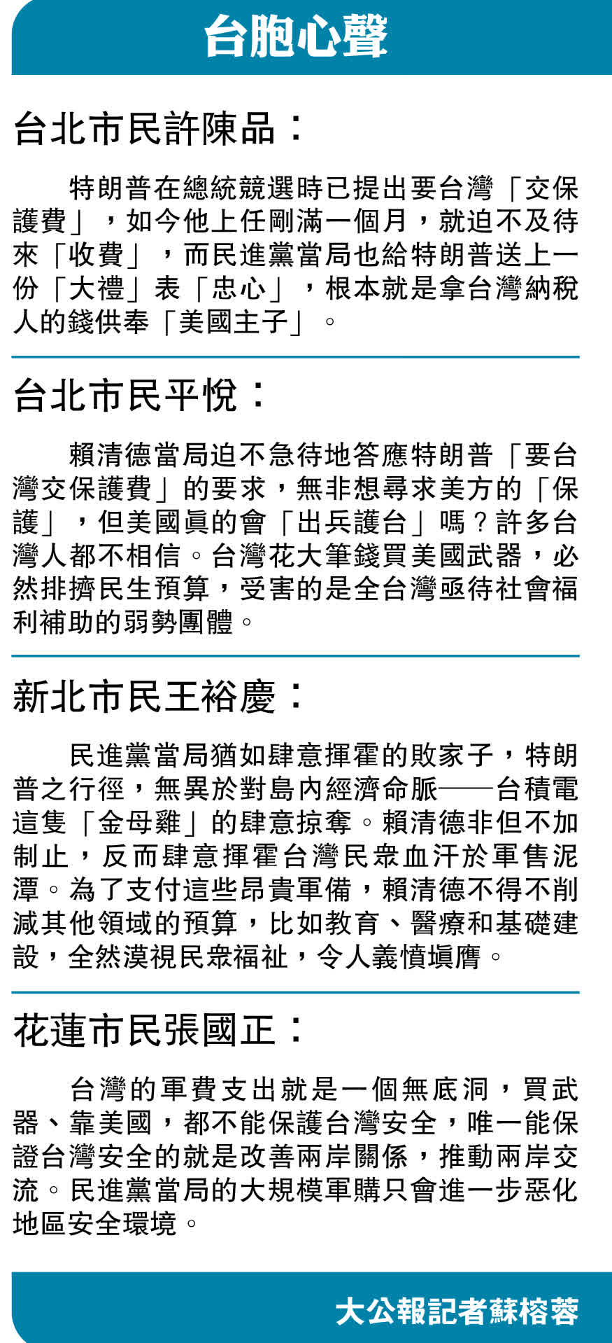 台民眾:巨額軍購買不來安全
