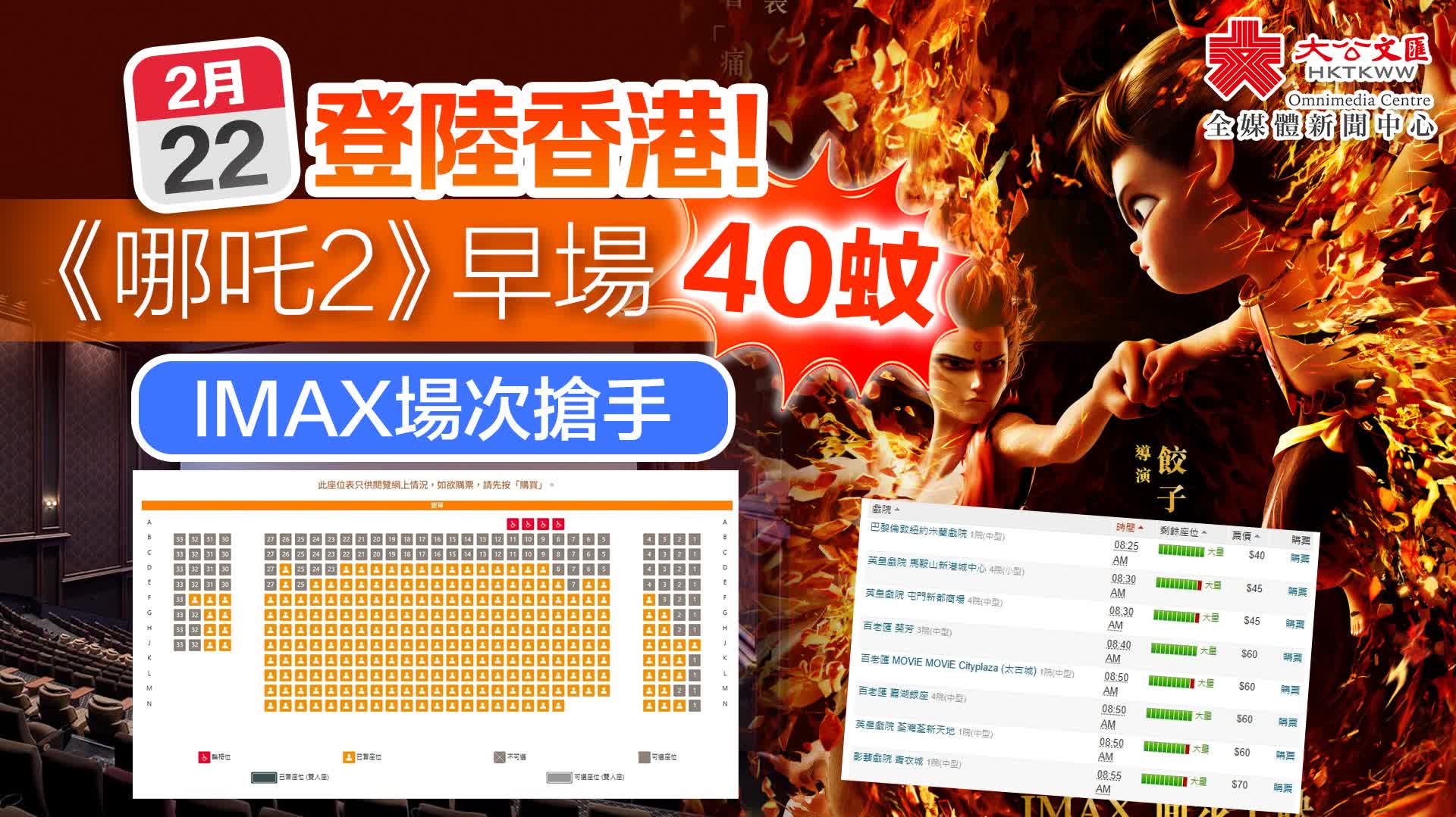 (大公文匯全媒體記者 馮書朋)備受期待的國產動畫電影《哪吒之魔童降世》續集《哪吒2》將於2月22日(星期六)正式登陸香港各大戲院。記者今日(19日)查閱多家購票平台發現,IMAX場次門票銷售火爆,後排好位置幾乎被搶購一空,僅剩少量前排座位。相比之下,普通場次仍有大量餘票可供選擇。
