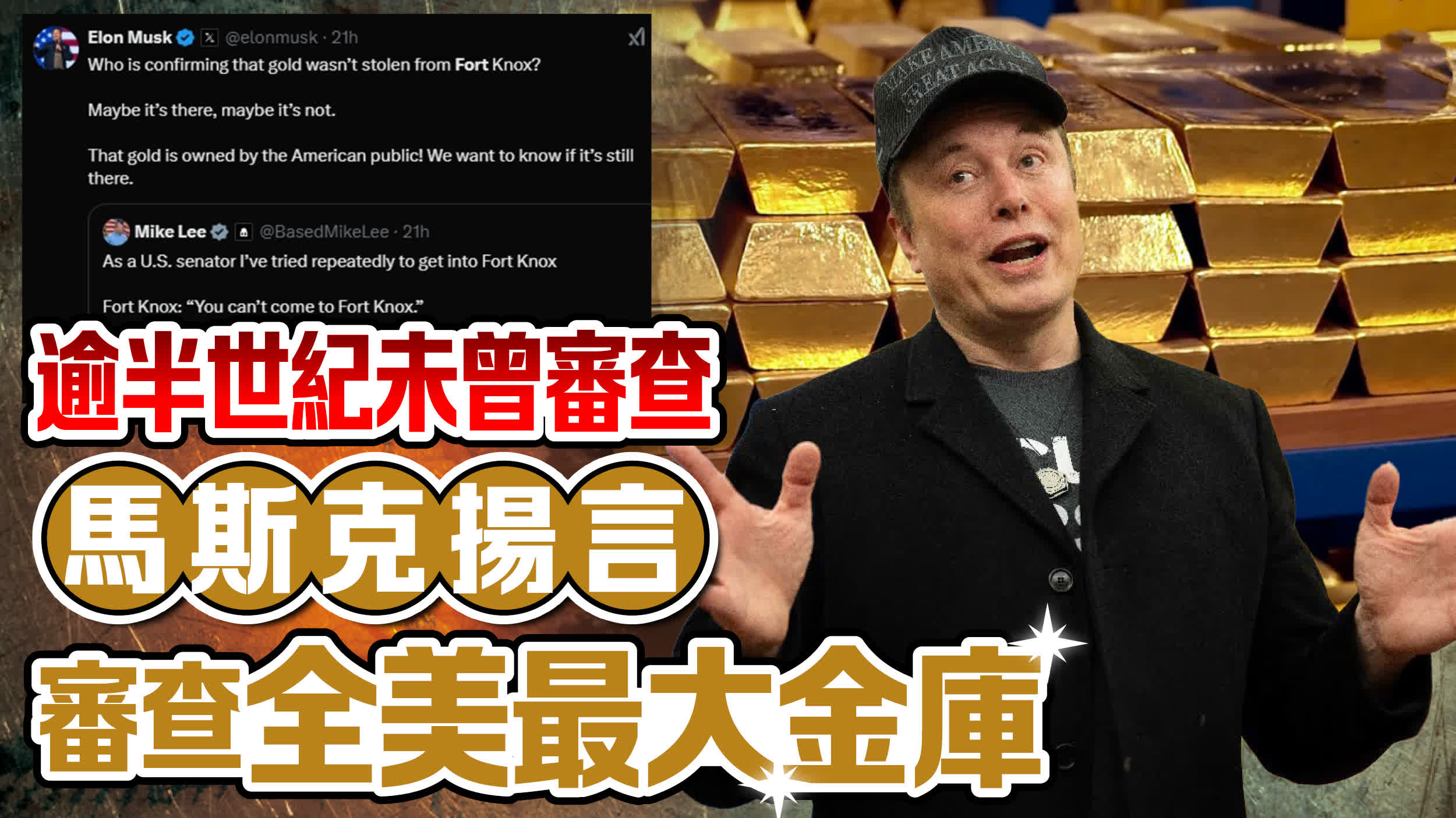 馬斯克當日在社交平台X上分享共和黨參議員邁克·李的帖子,李在該帖文表示,他要求進入諾克斯堡基地卻被拒絕。馬斯克轉發這則帖文稱,「誰能確認諾克斯堡的黃金沒有被盜?也許在那裏,也許不在。這些黃金屬於美國公眾!我們想知道它是否還在那裏。」
